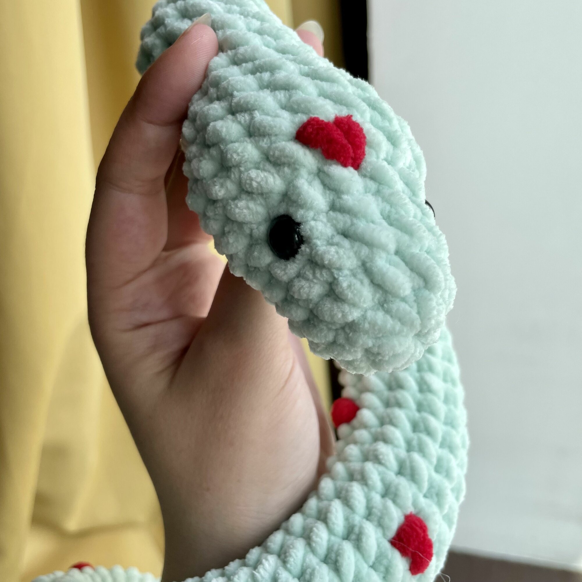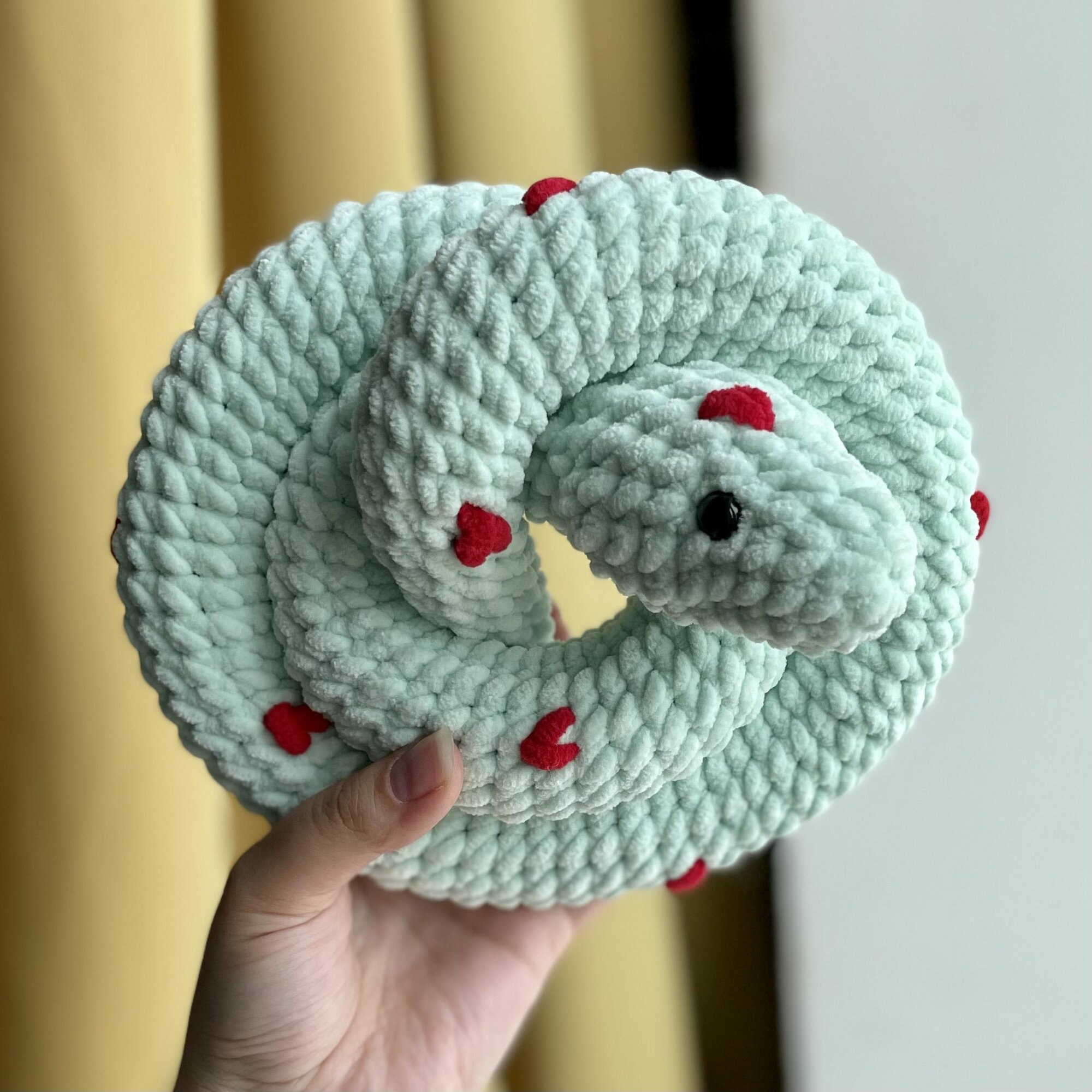 Вязаная мягкая игрушка "Змея" / змейка с сердечками / мятный 100