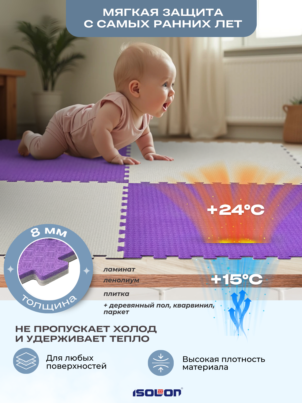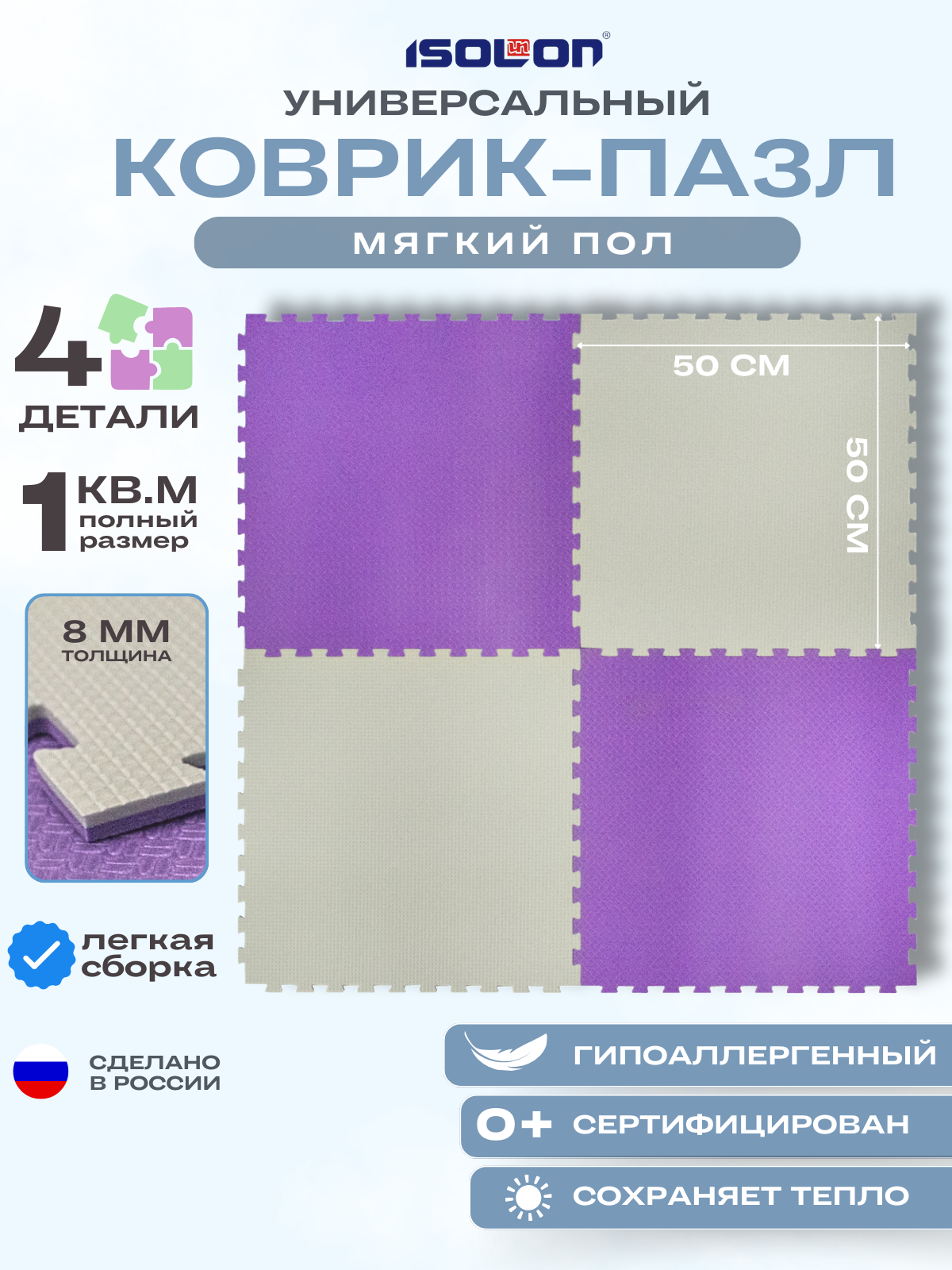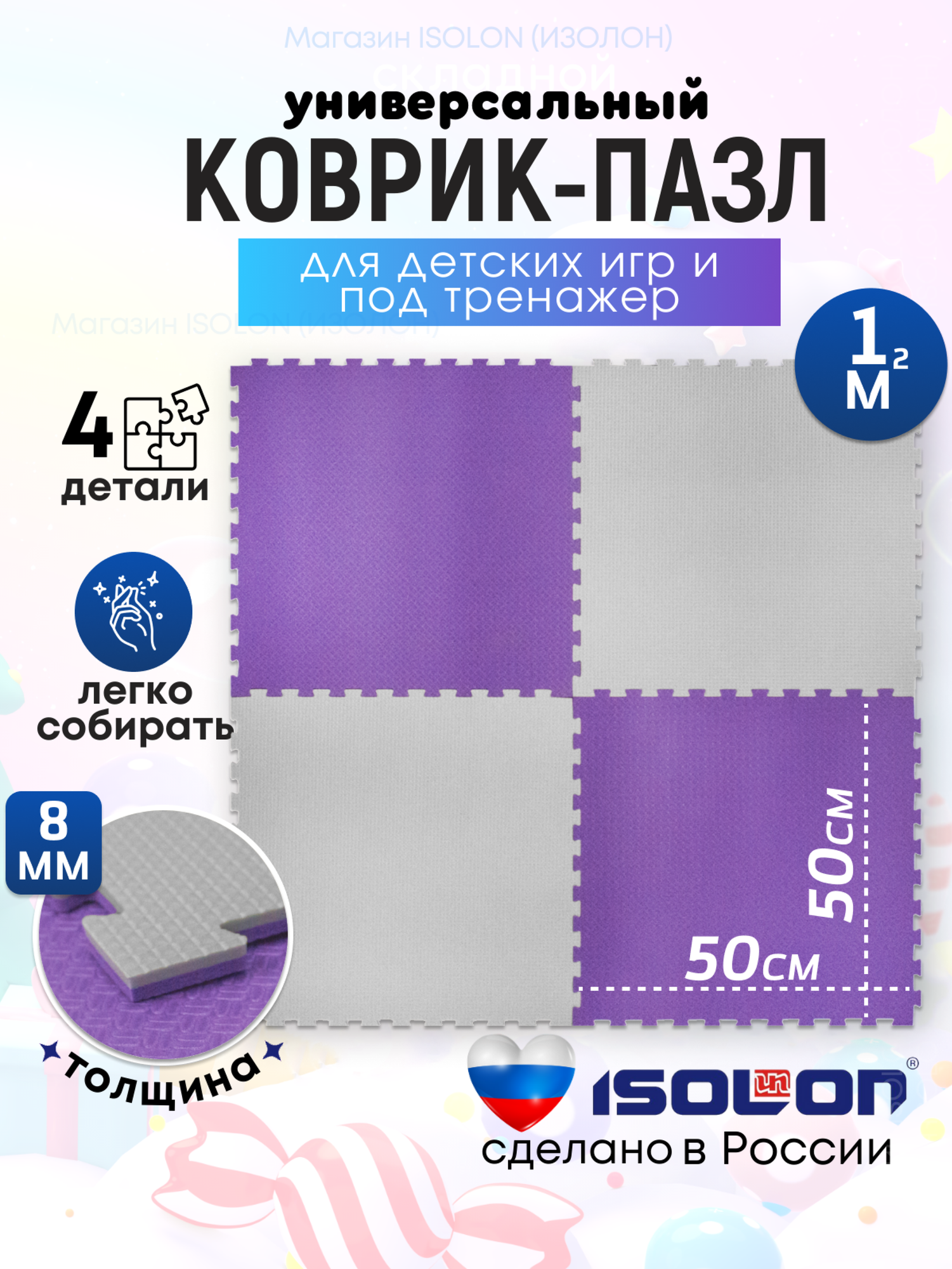 Купить Мат коврик-пазл мягкий пол Isolon, 50х50 см, в комплекте 4 шт, фиолетовый/серебро
