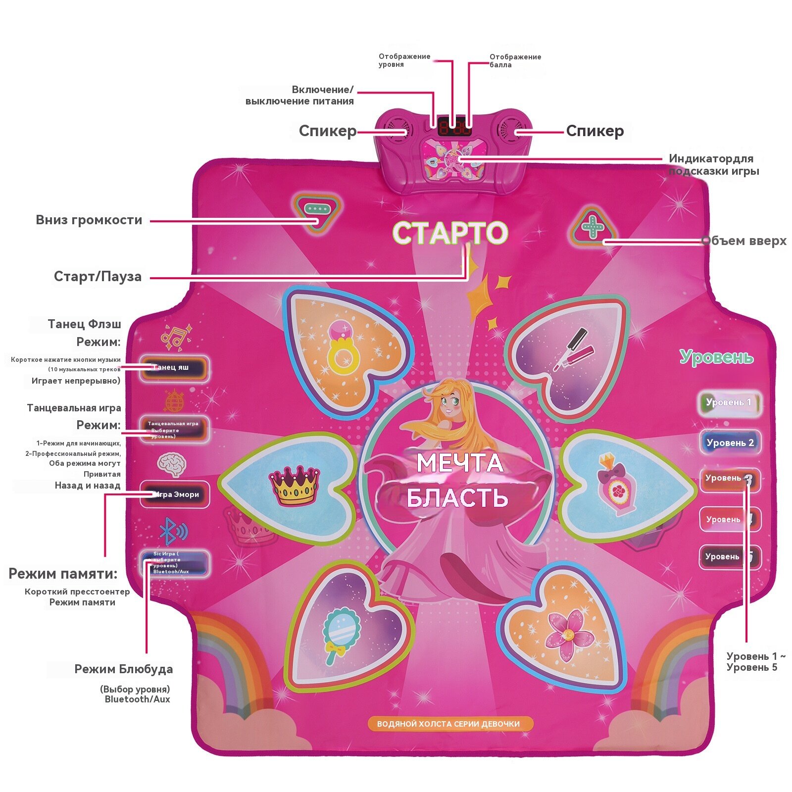 Ниже Вы можете прочитать отзывы на Музыкальный коврик, для танцев, непромокаемый пластик, розовый, Bluetooth function, ознакомится с подробными характеристиками, посмотреть интересные обзоры и фотографии на Музыкальный коврик, для танцев, непромокаемый пластик, розовый, Bluetooth function.