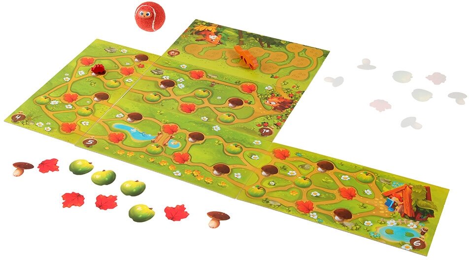 | Комплектация | В состав настольной игры Перекати-ёжик входят: 1 мохнатый мячик, 1 жетон-липучка с мордашкой ёжика (для мяча), 1 фигурка лисы, 4 фигурки ёжиков разных цветов, 7 двусторонних полей, 18 жетонов-липучек (по 6 грибочков, яблочек и листочков), 1 памятка бросков, правила игры. |