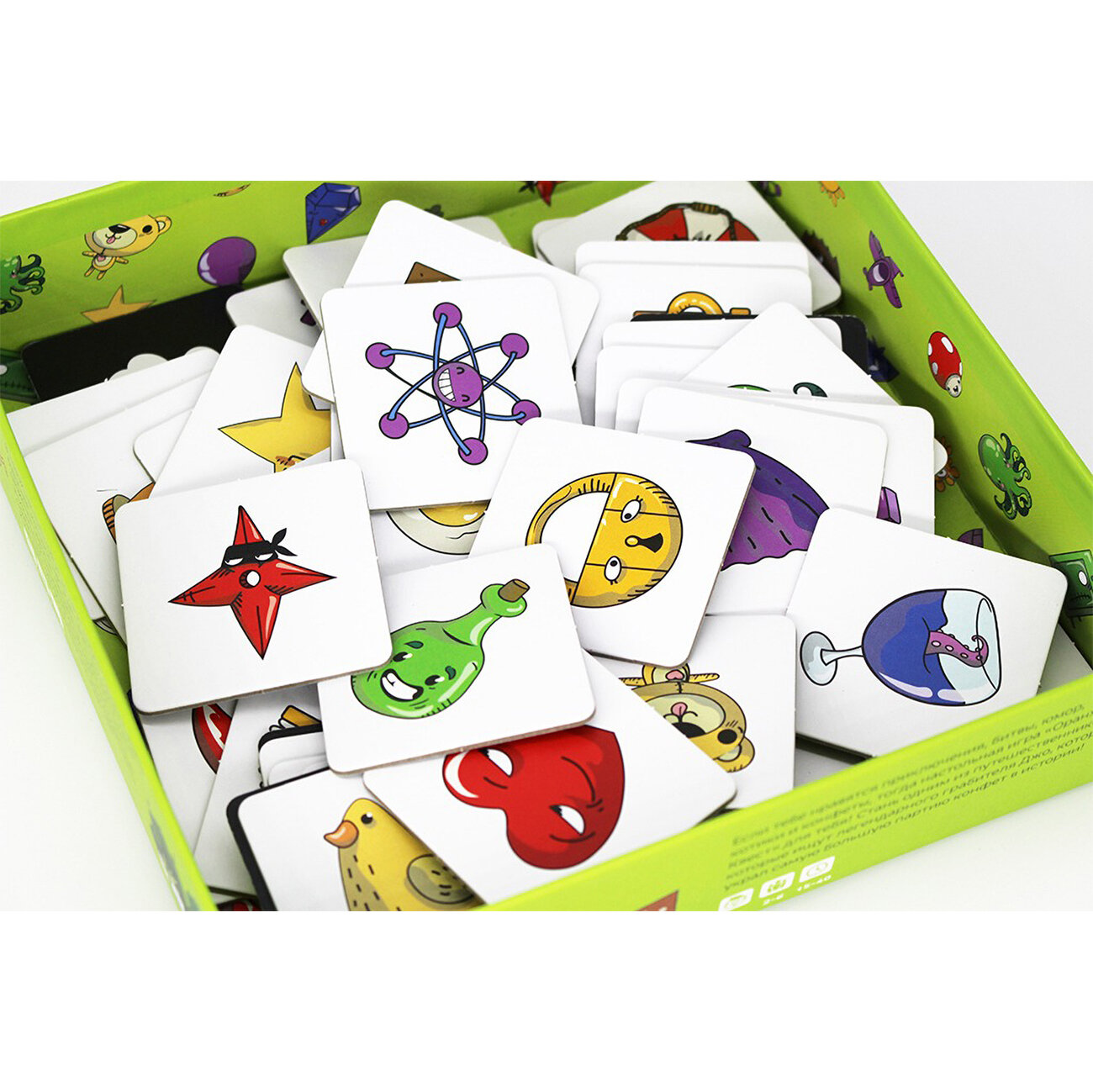 | Комплектация | 45 двусторонних жетонов с разными объектами, 56 двусторонних карточек, правила игры, пакетики для компактного хранения |