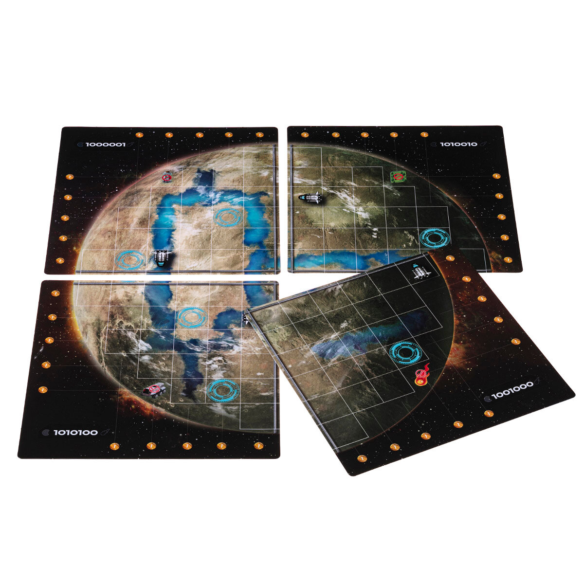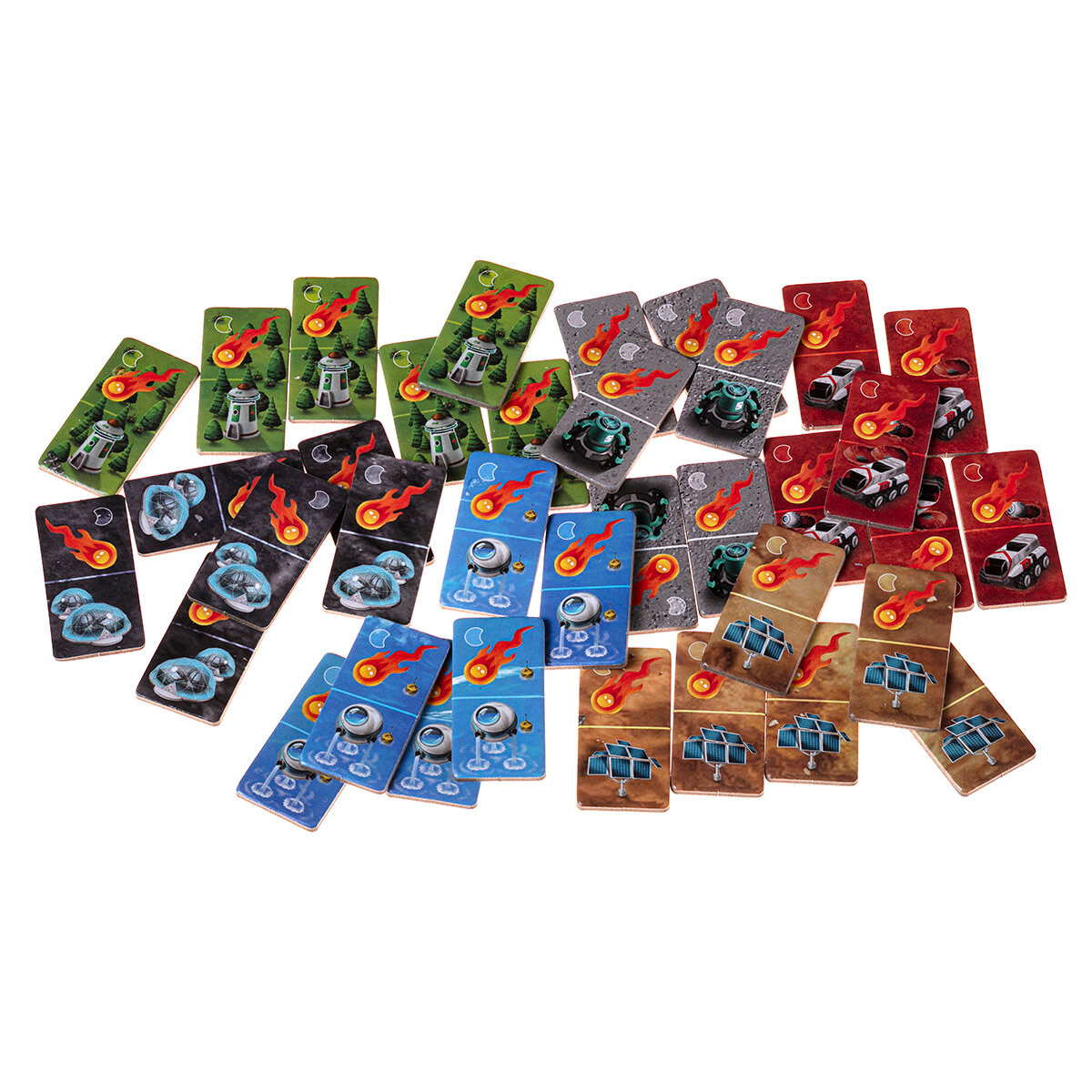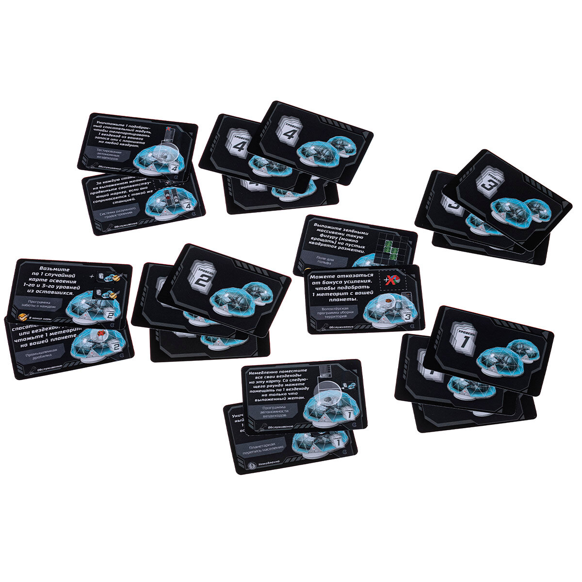 | Комплектация | 1-й модуль 6 планшетов лун (Лицевая сторона - начальная. Обратная сторона - уникальная), 6 орбитальных спутников, 2-й модуль 36 аварийных жетонов (по 6 каждого типа), 3-й модуль 6+ массивов поселенцев, 6+ массивов воды, 6+ массивов исследований, 6+ массивов вездеходов, 6+ массивов электроснабжения А также 20 карт освоения (5 карт 1-го уровня, 5 карт 2-го уровня, 5 карт 3-го уровня, 5 карт 4-го уровня), 27 карт событий (9 с зелёным сигналом, 9 с оранжевым сигналом, 9 с красным сигналом), 12 множителей метеоритов (по 6 каждого вида), Планшет расколотой планеты (состоит из 4 четвертей), Планшет разделённой корпорации (состоит из 2 половин), Крышка для органайзера S. U. S. A. N. |