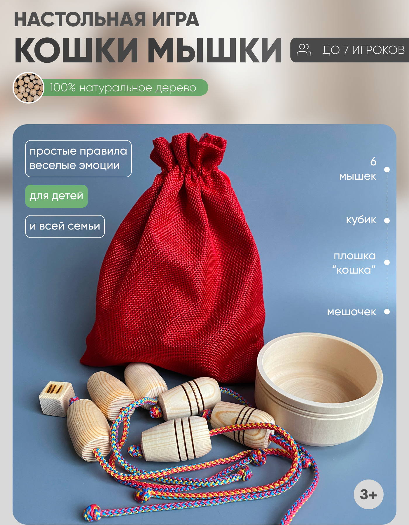 | Комплектация | 3 мышки с полосками, 3 без полосок, игровой кубик, плошка-кошка, мешочек, правила игры |