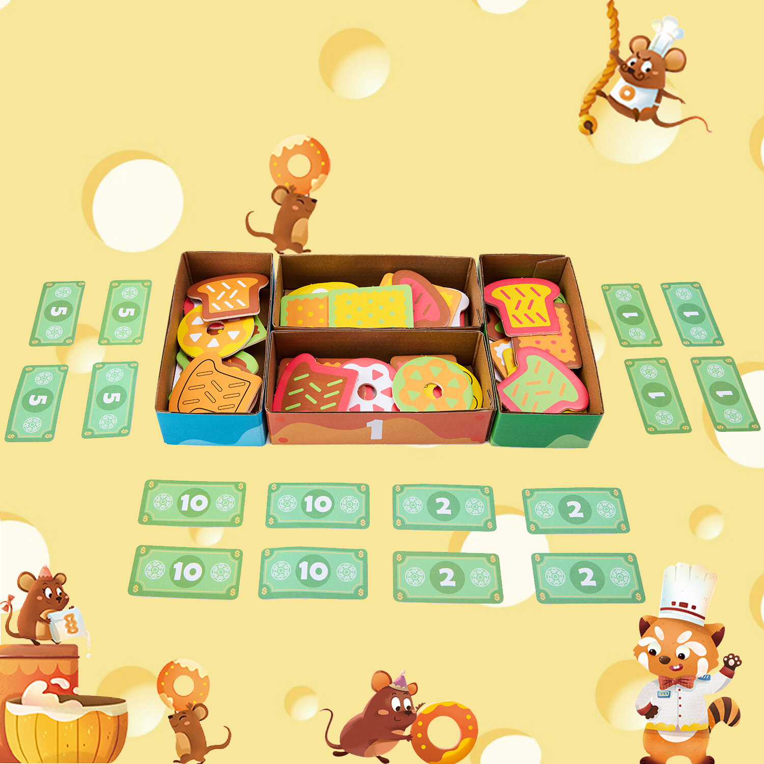| Комплектация | фигурка енота, 41 кусочек хлеба, 64 купюры, карточка-меню, 4 лоточка, инструкция, буклет, 3 кубика. |