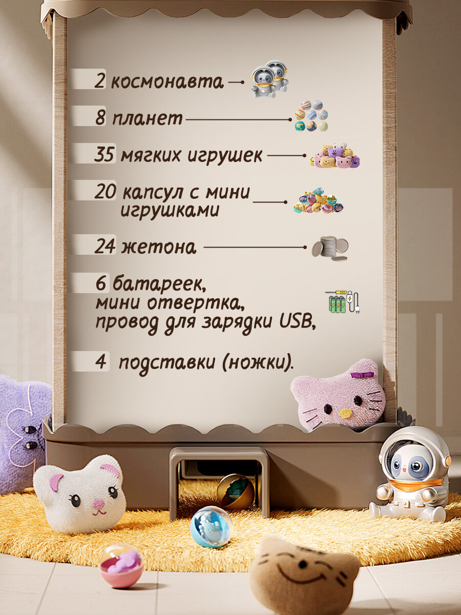 | Комплектация | игровой автомат - 1шт; игрушка в шарике - 20шт; кабель USB - 1шт; батарейка - 4шт; отвертка - 1шт; космонавт - 1шт; мягкая игрушка - 10шт; игровой жетон - 24шт |