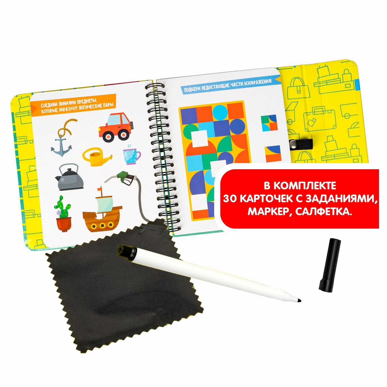 | Подробная комплектация | В комплект входят: 30 карточек с заданиями, стирающийся маркер, салфетка. |