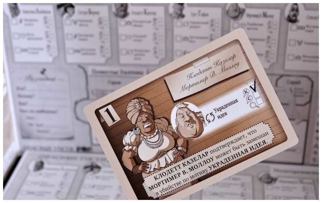| Комплектация | 243 карты 1 держатель для колоды сброса 1 карта "ЗАСЕКРЕЧЕНО" 1 блокнот с листами для заметок 1 жетон первого игрока - фигура мистера Уолтона 8 жетонов разгадки 8 ширм игроков 12 жетонов предложений 4 жетона расследования 6 карт профилей подозреваемых буклет правил |