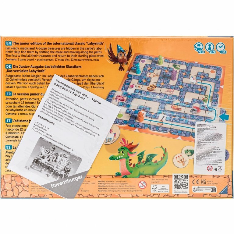 | Подробная комплектация | 1 игровое поле 4 волшебника 12 секретных фишек 17 плиток с изображением ходов лабиринта Инструкция на русском языке |