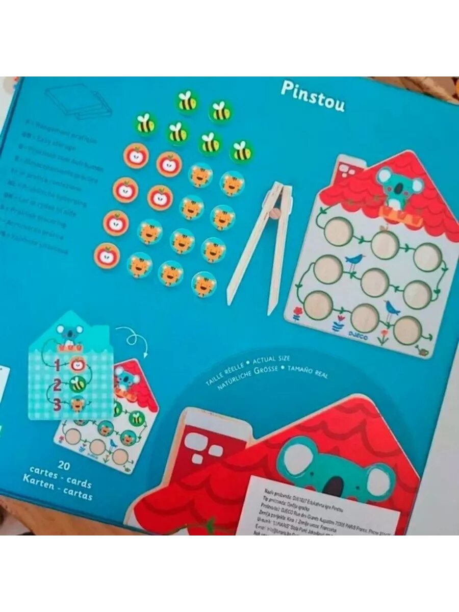 | Комплектация | деревянное игровое поле; 22 деревянных фишки; деревянный пинцет; 20 карточек с заданиями |