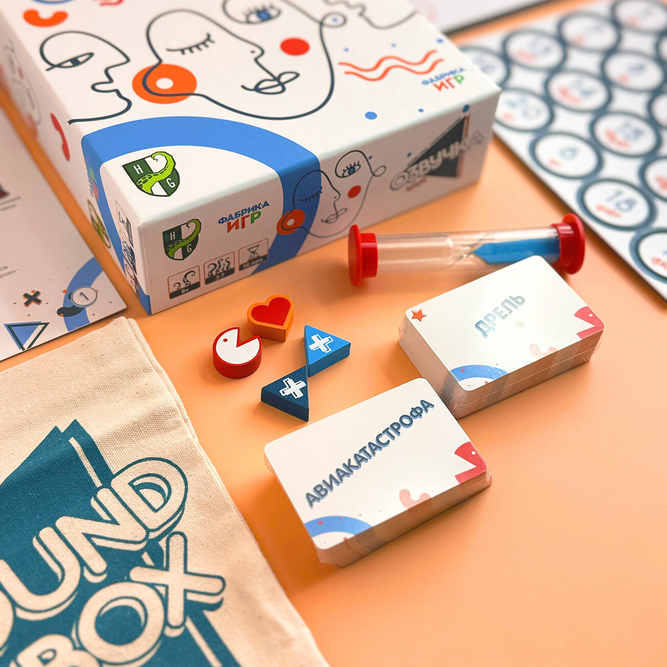 | Комплектация | 1 игровое поле 1 песочные часы 1 маркер прогресса 1 сердечко 20 нумерованных жетонов 2 деревянных жетона двойной озвучки 1 очки отгадывающего 1 очки звукорежиссёра 110 карт звуков Правила игры на русском языке |
