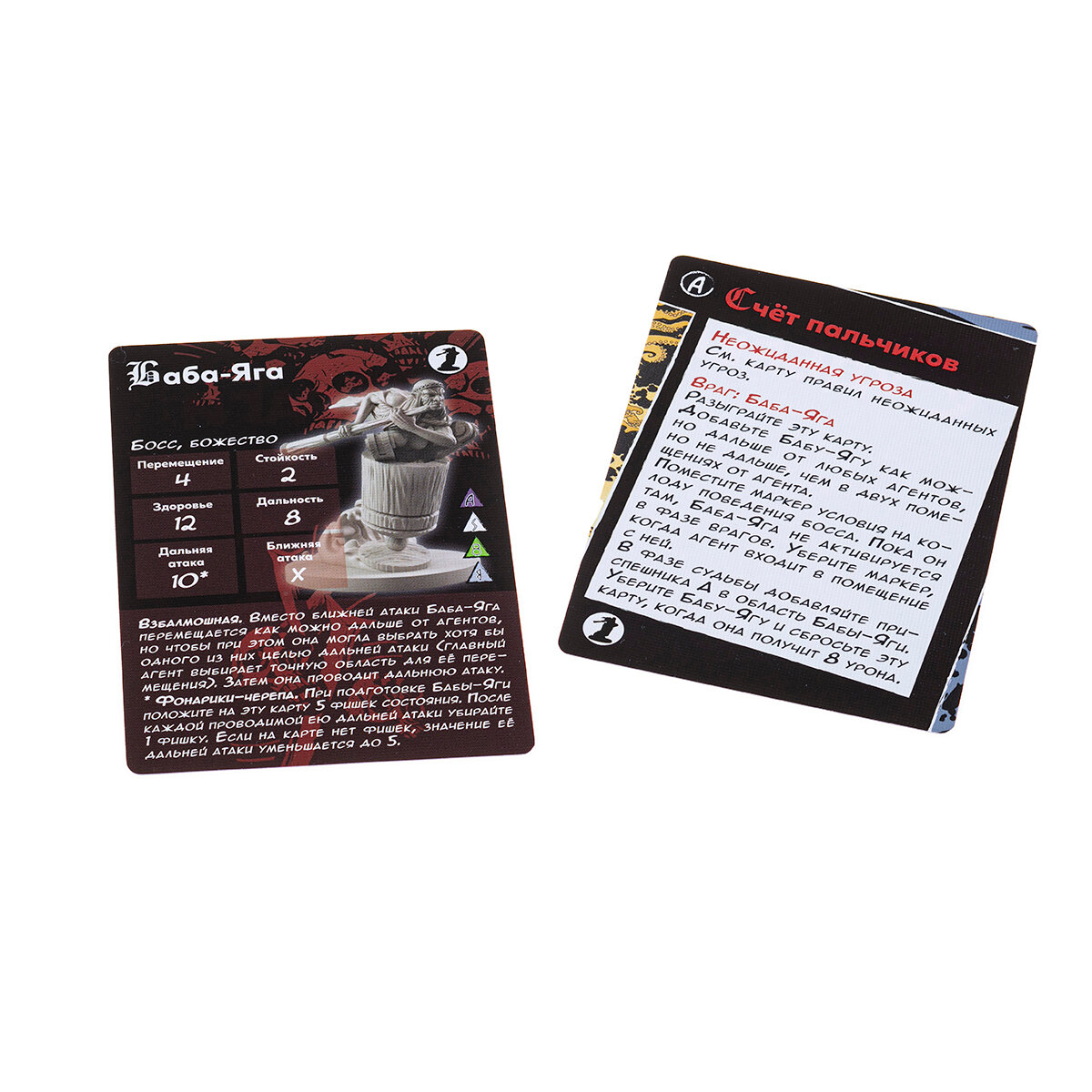 | Комплектация | Фигурка Бабы-Яги, 2 карты для конструктора дел, 1 карта правил, 1 карта неожиданной угрозы, 1 карта босса, 2 карты поведения босса |