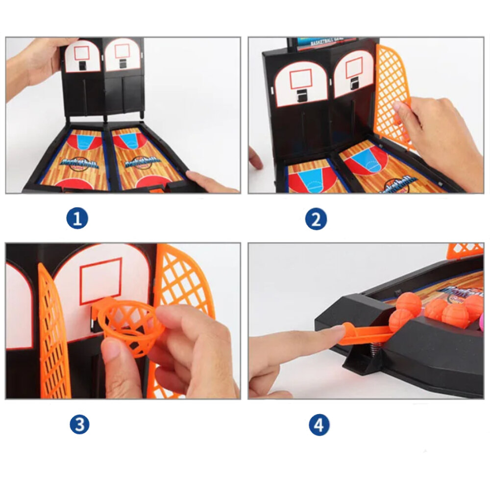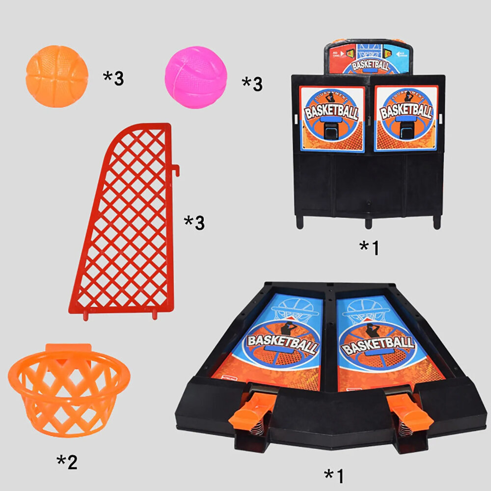 | Комплектация | -детали для сборки игры (нижняя основа, стена, 3 ограждения, 2 баскетбольных кольца 3.5 х 3.5 см); -6 мячиков 2 х 2 см (по 3 штуки каждого цвета). |