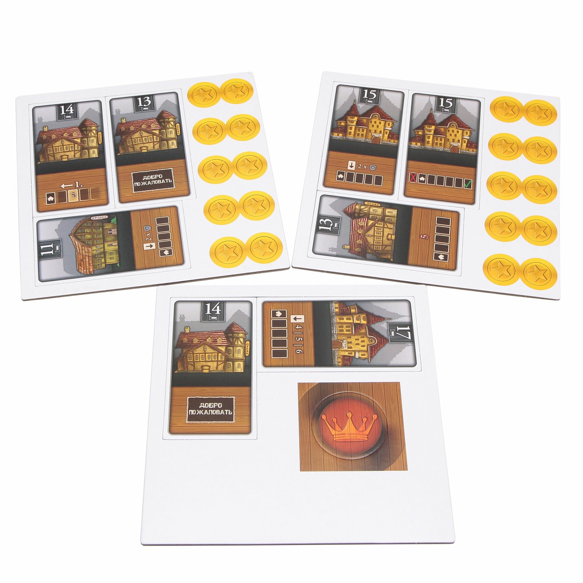 | Комплектация | 96 карт гостей, 8 карт гостиниц, 20 фишек победных очков, 1 маркер первого игрока, 4 карты-памятки, 4 карты подсчета очков, правила игры |