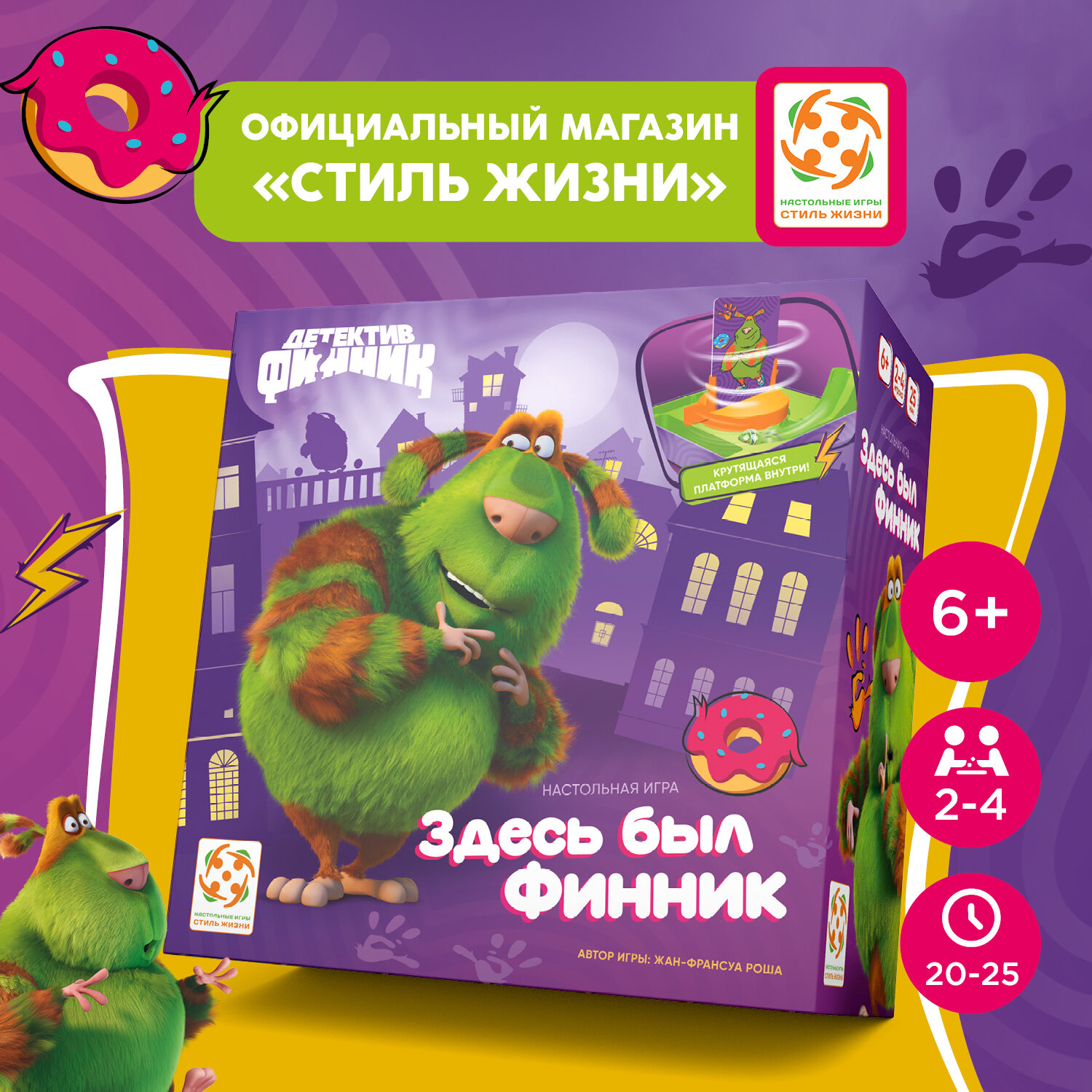 | Комплектация | В состав настольной игры входят: 68 карточек-кадров; 40 жетонов пончиков номиналом 10 пончиков; 16 жетонов наград; 5 фишек игроков; 5 пластиковых подставок для фишек; 1 счётчик победных очков (пончиков); правила игры. |