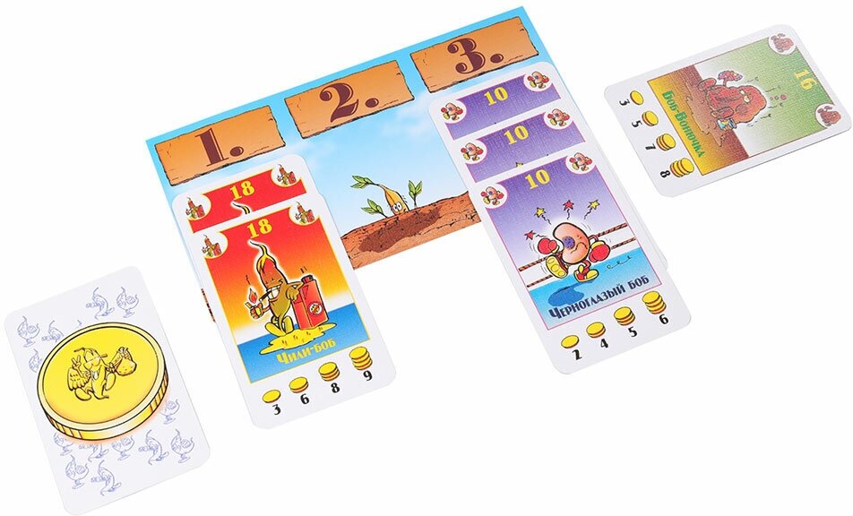 | Комплектация | В состав настольной игры Бонанза входит: 104 карты бобов, 5 двусторонних карт поля и правила настольной игры. |