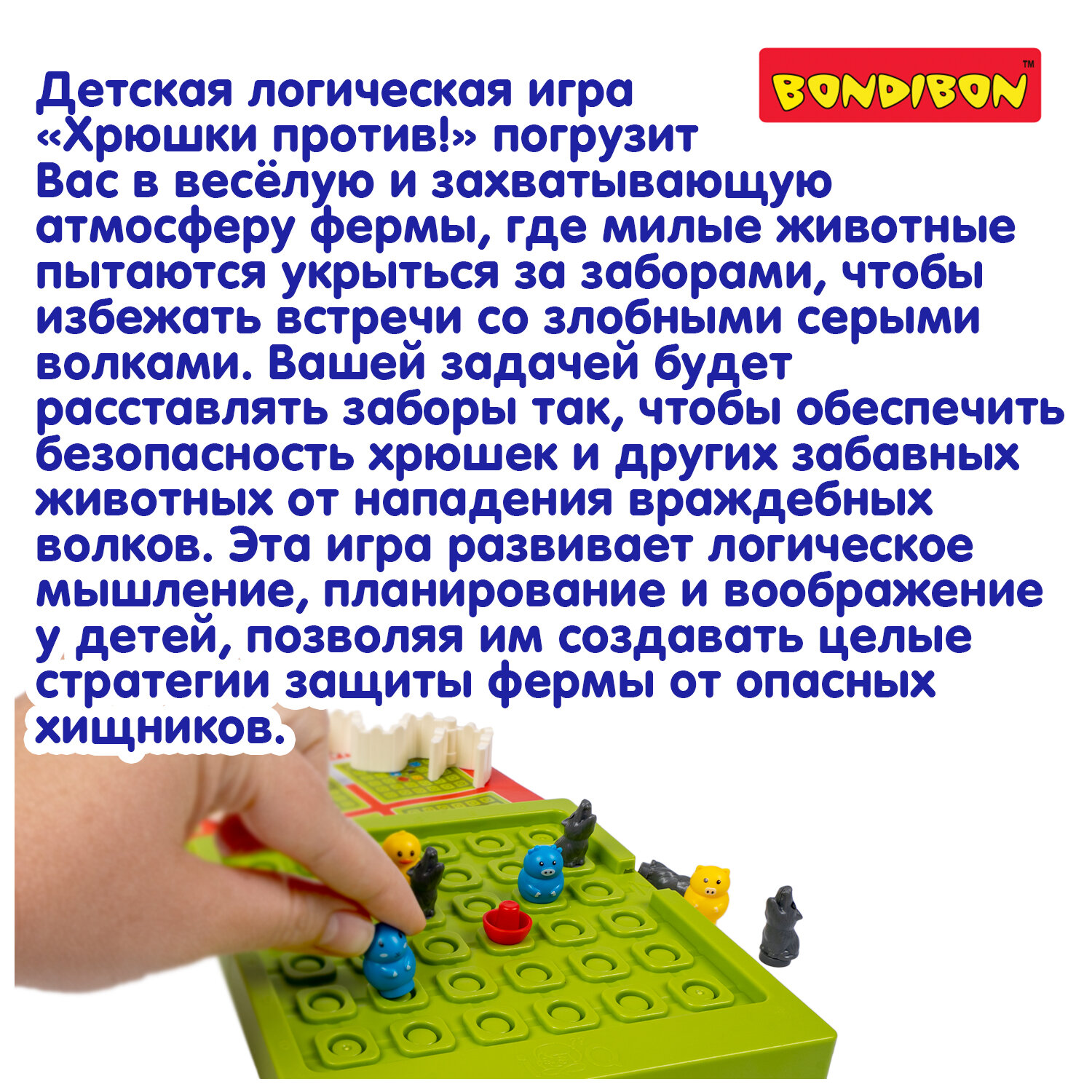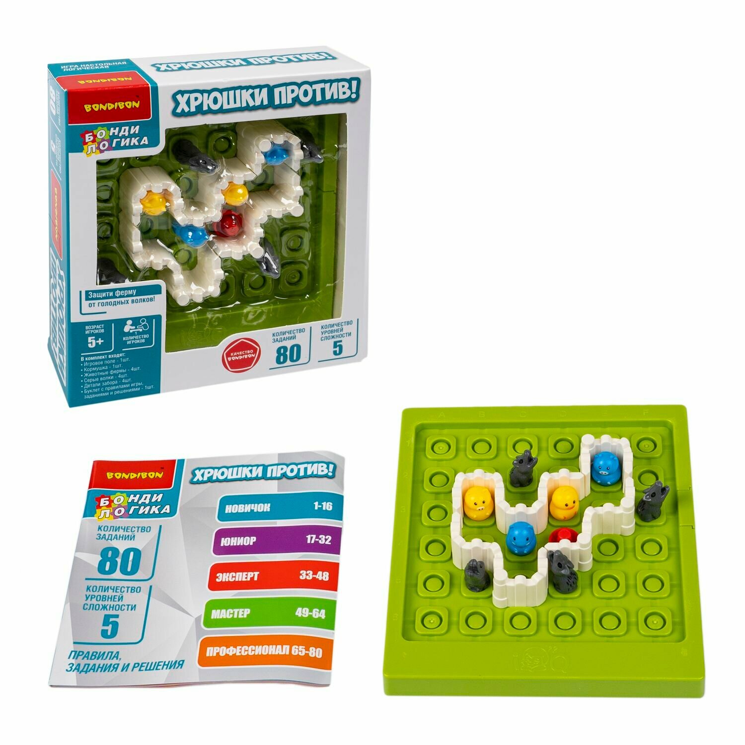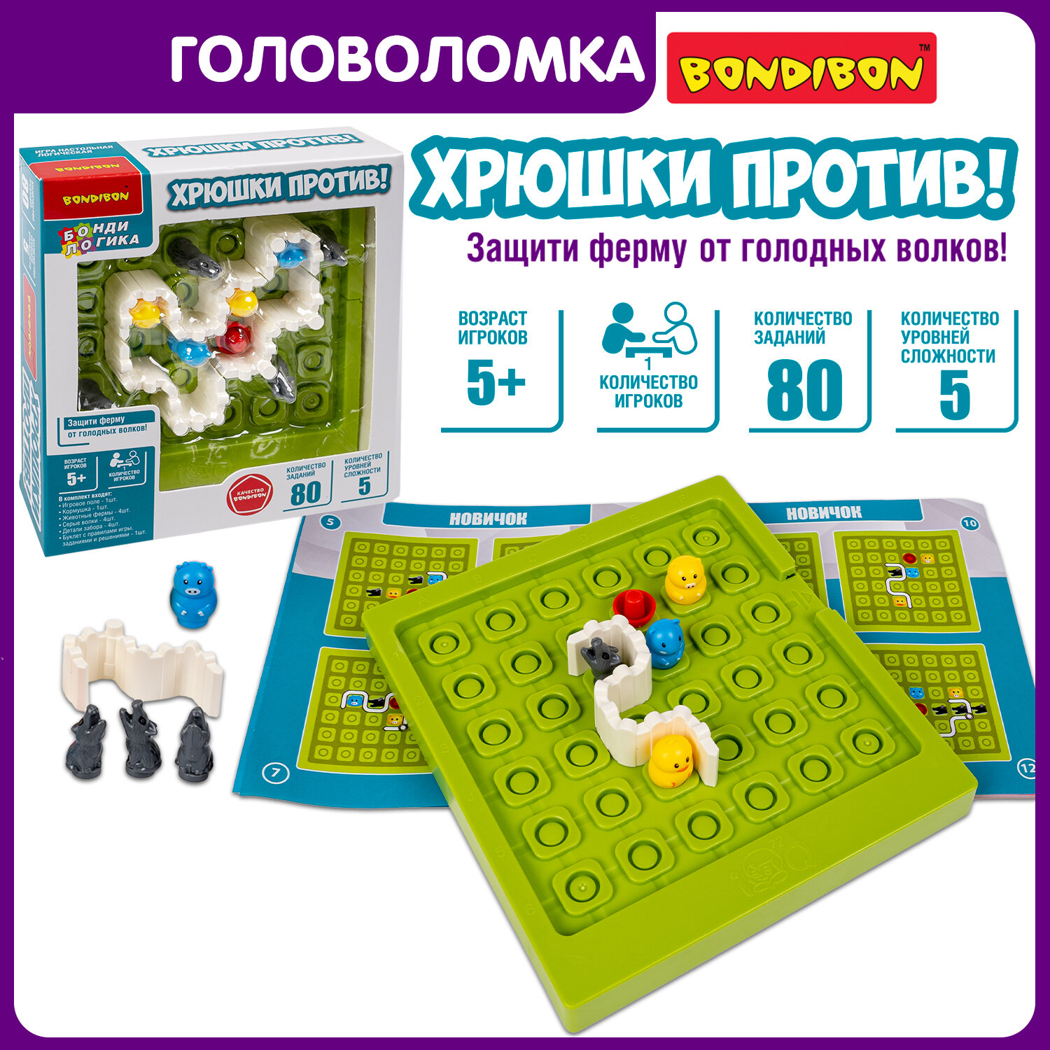 | Подробная комплектация | В набор входят: игровое поле, кормушка, 4 животных фермы (свинка, цыпленок, бычок, хомяк), 4 волка, 4 детали забора, буклет. |
