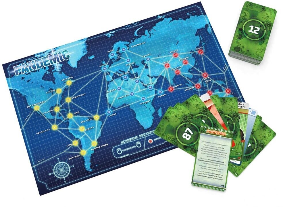 | Комплектация | В состав настольной игры входят: 1 игровое поле, 5 карт ролей, 4 фишки, 48 карт болезней, 62 карты населения, 61 карта игрока (48 карт городов, 5 карт Эпидемий, 8 карт событий), 4 памятки, 4 гражданские карты, 6 исследовательских станций, 5 досье и лист со стикерами, 4 маркера лекарств, 1 маркер распространения болезней, 1 жетон напоминания, 1 маркер вспышек болезней, 96 кубиков болезней, 1 упаковка с 8 закрытыми пронумерованными наборами компонентов внутри и правила игры на русском языке. |