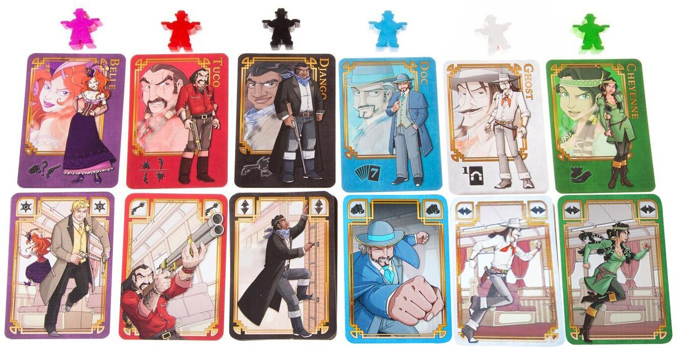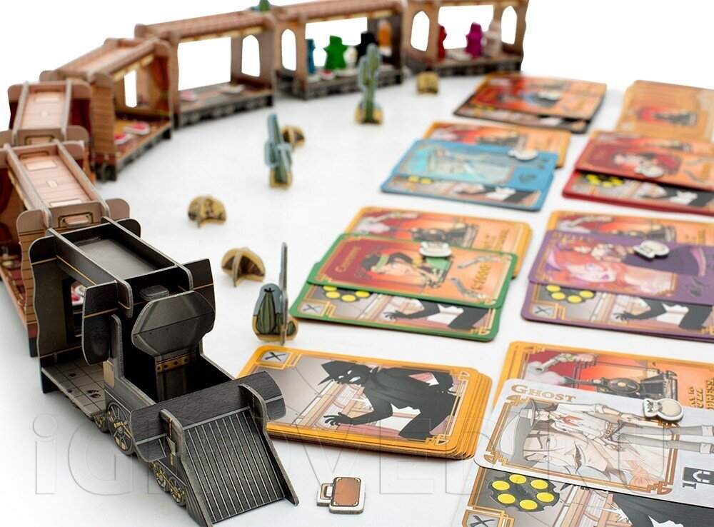 | Комплектация | В комплект настольной игры входят полный набор элементов для сборки шести вагонов, локомотива и декораций, 7 деревянных фигурок, изображающих бандитов и шерифа, колода карт, жетоны добычи, правила игры на русском языке. Внутри коробки предусмотрены специальные отсеки для уже собранных вагонов. |