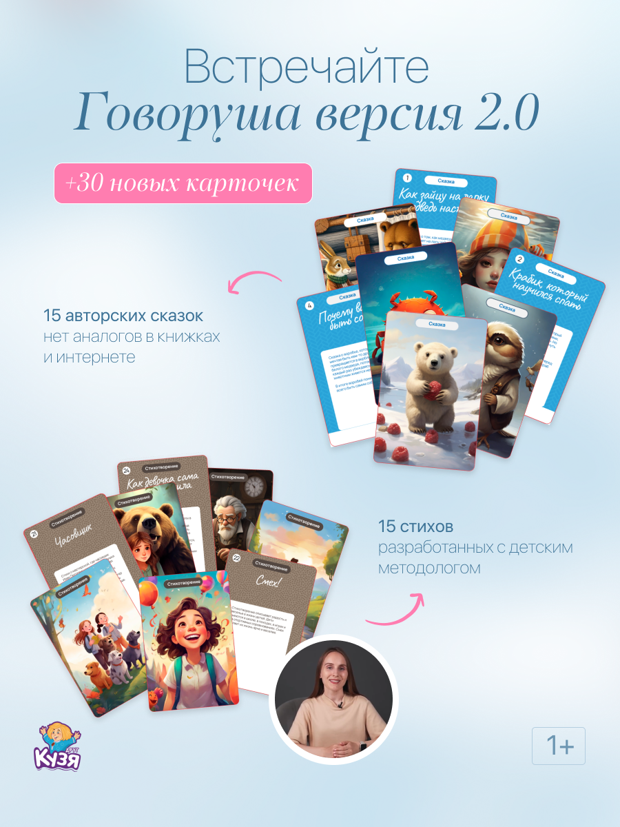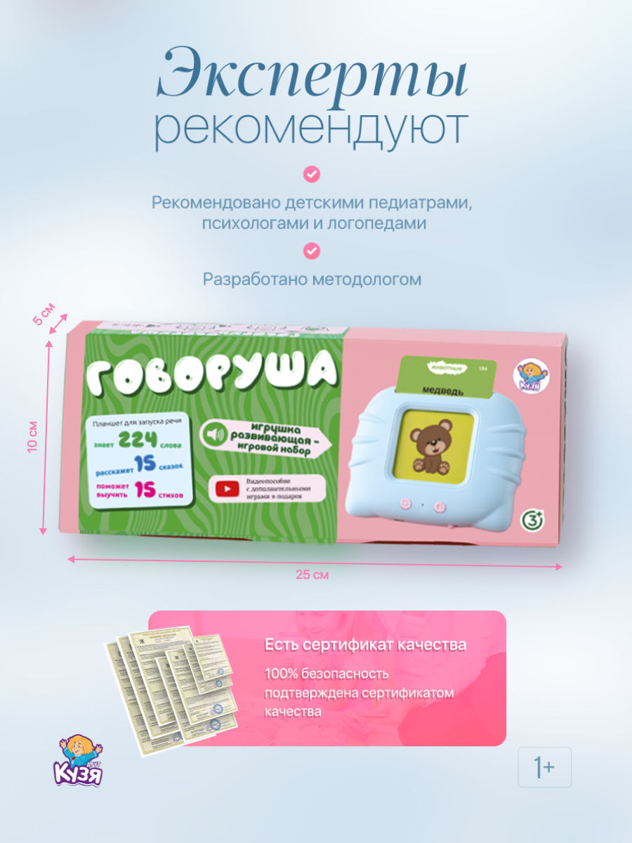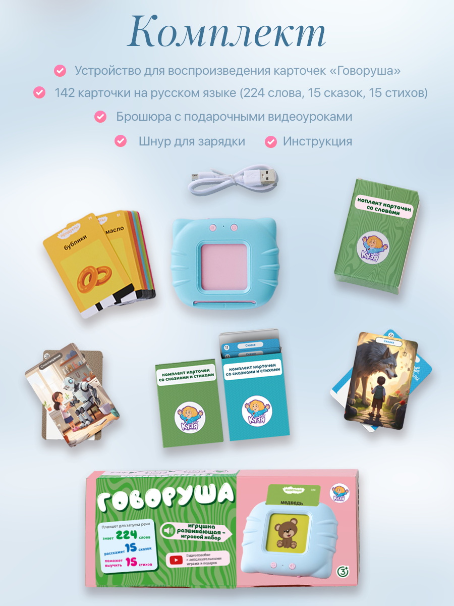 | Комплектация | планшет Говоруша, 112 карточек, инструкция, шнур для зарядки, брошюра с видеоуроками |