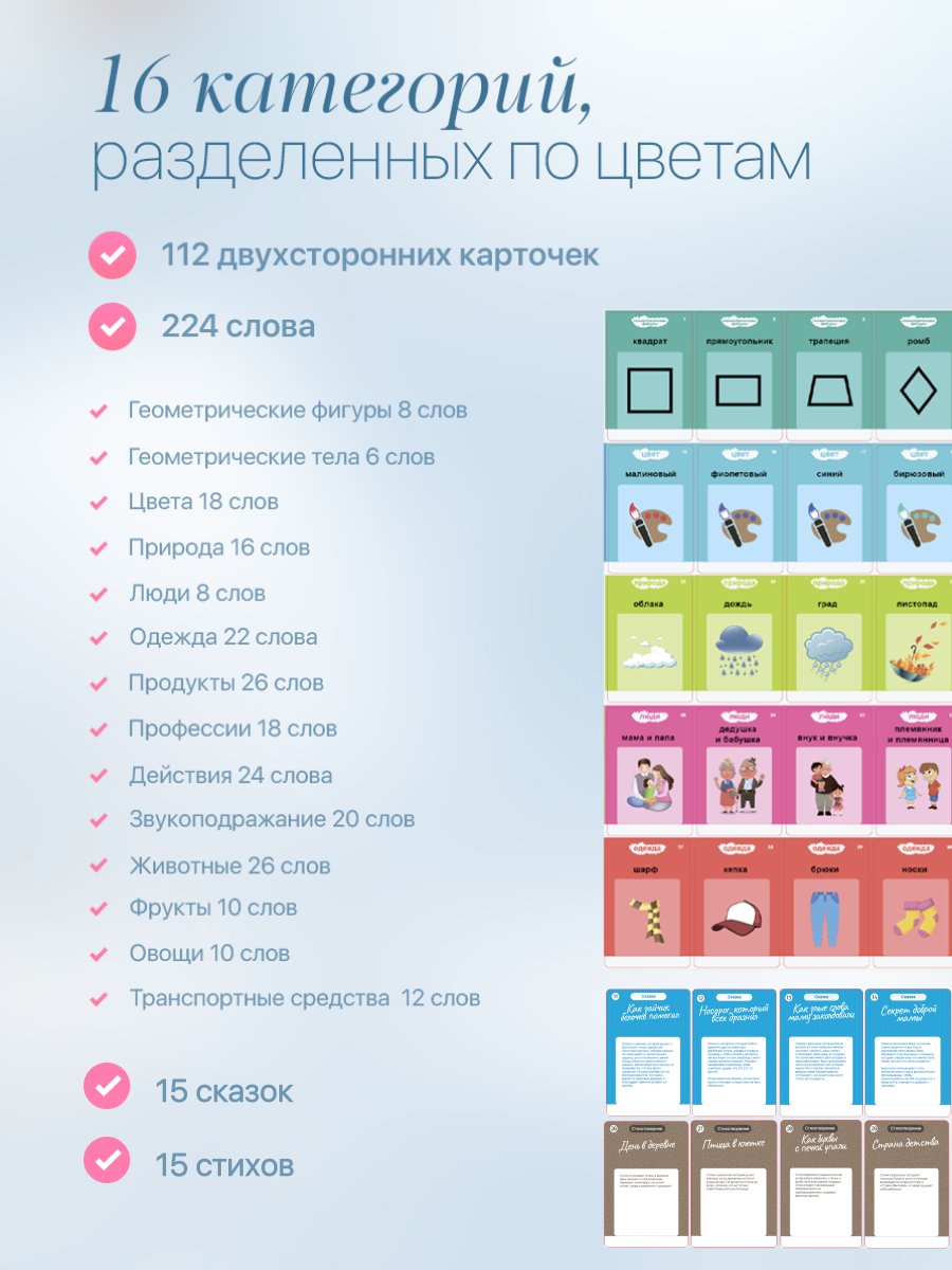 | Дополнительная информация | 14 категорий; 112 карточек; 224 слова; русскоговорящий |