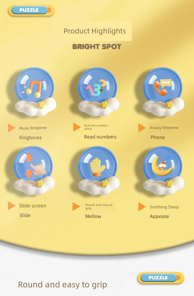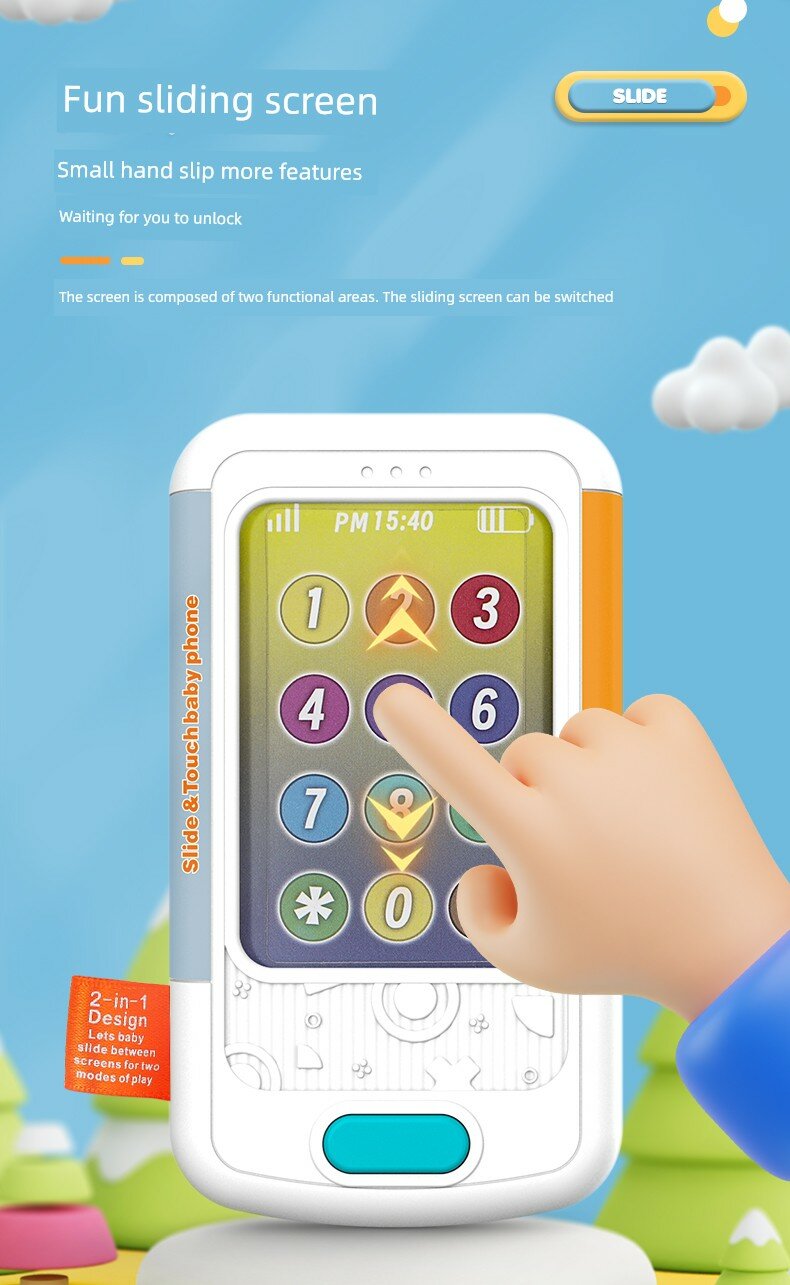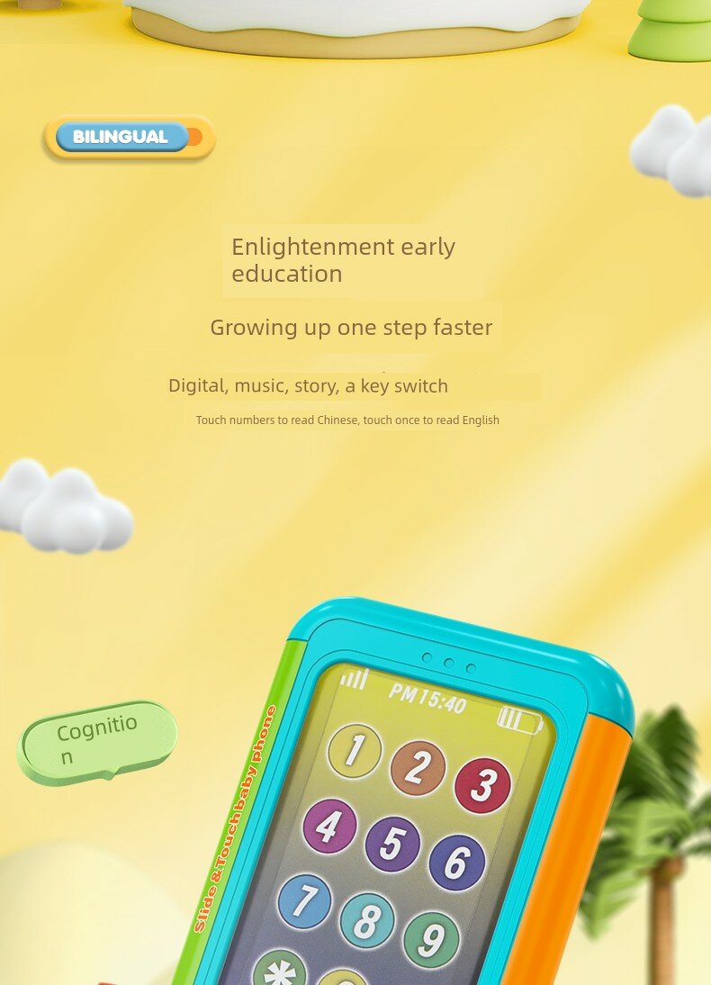 | Дополнительная информация | двуязычный, развивающее раннее образование, сенсорный экран, развитие логического мышления, круглый и удобный для захвата, регулируемая двухступенчатая громкость, забавный выдвижной экран, цифровой дисплей, музыка, истории, кнопочный переключатель, имитация входящих звонков, 6 детских песен, 6 песен для фортепиано, 6 колыбельных, 5 детских звуковых эффектов, 5 звуковых эффектов SMS, 5 звуковых эффектов погоды, три коротких рассказа, возможность делать фотографии, нежные успокаивающие звуки для детских ушей |