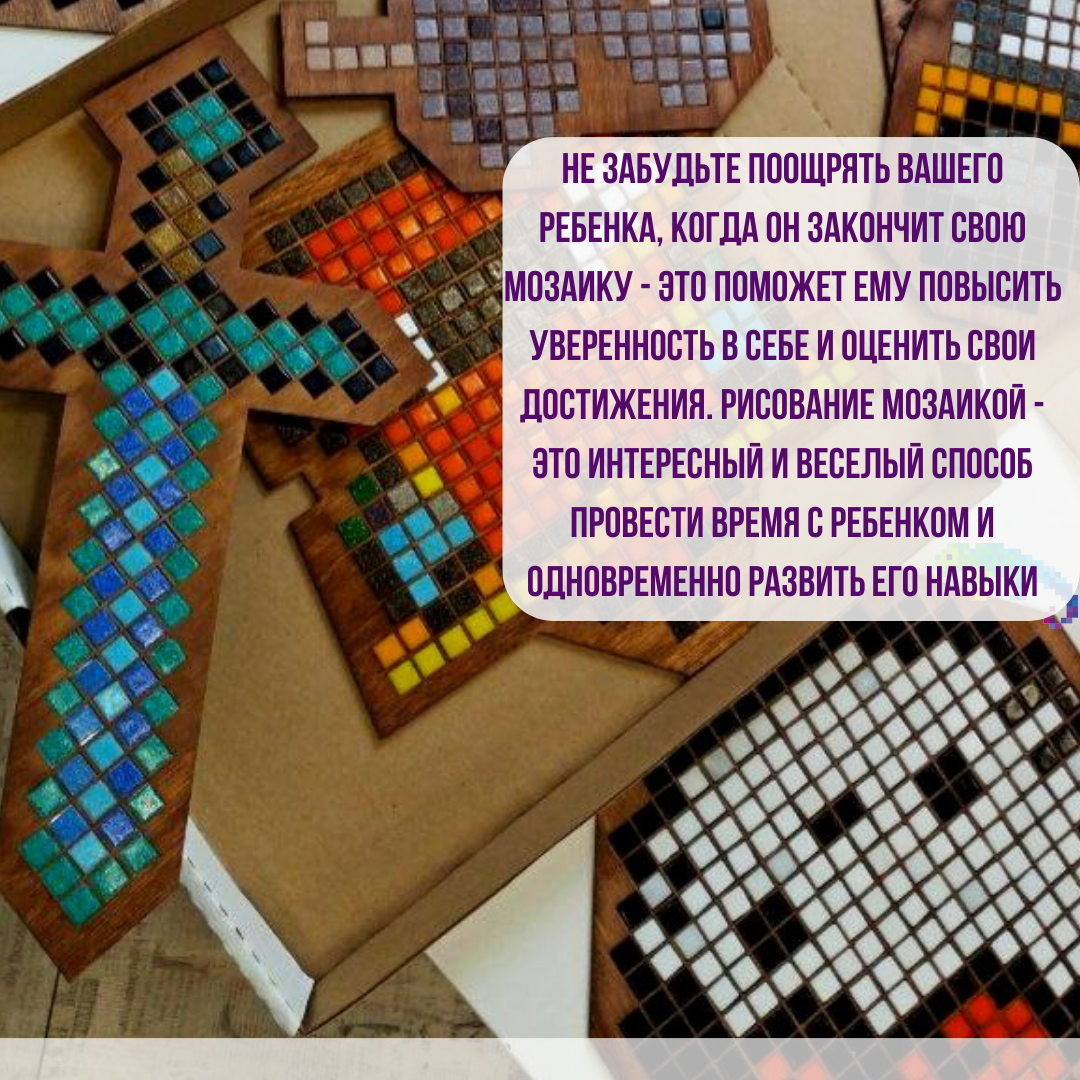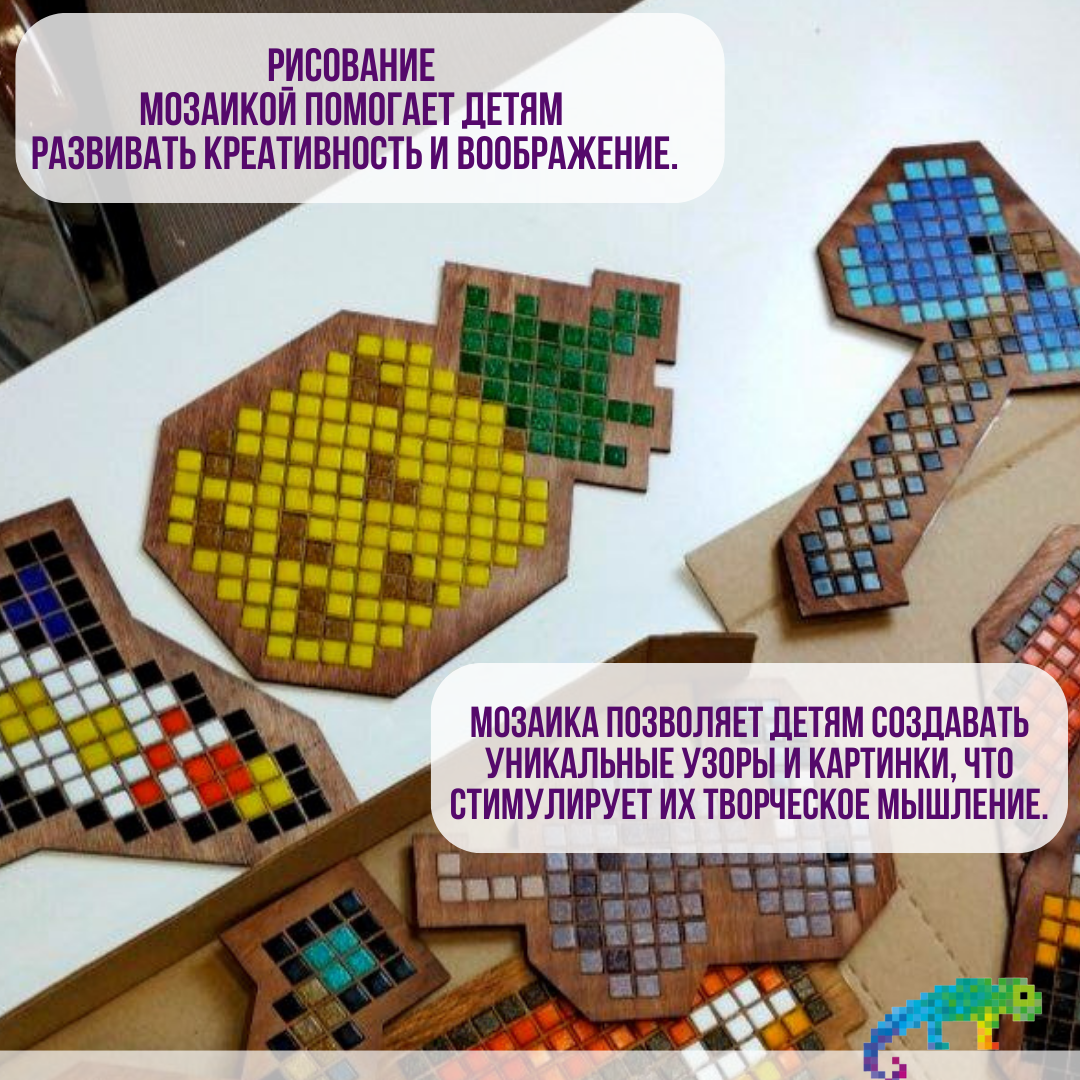 | Дополнительная информация | В комплект входят: Форма-матрица из фанеры и разноцветные фишки из прессованного стекла и мрамора, которые крепятся на клейкую ленту. Есть подставка. Набор упакован в картонную коробку размером 30*30* см. Конструкция мозаики позволяет с лёгкостью фиксировать детали, которые состоят из высококачественных материалов, абсолютно безопасных для здоровья ребёнка. |