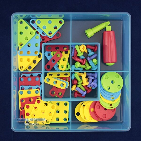 | Дополнительная информация | игровое поле 13 х 13 рядов, бокс с отделениями для хранения деталей, 16 квадратных пластин, 16 треугольных пластин, 16 круглых пластин, 16 прямоугольных пластин, 30 винтиков, отвёртка, инструкция; количество цветов 5 |