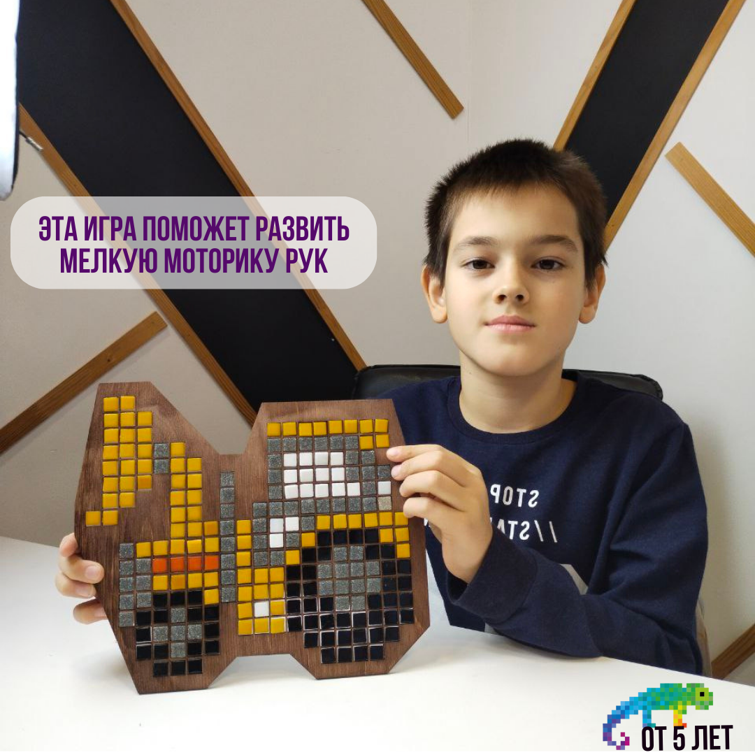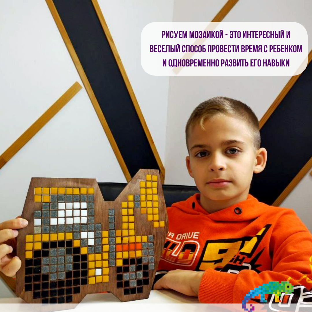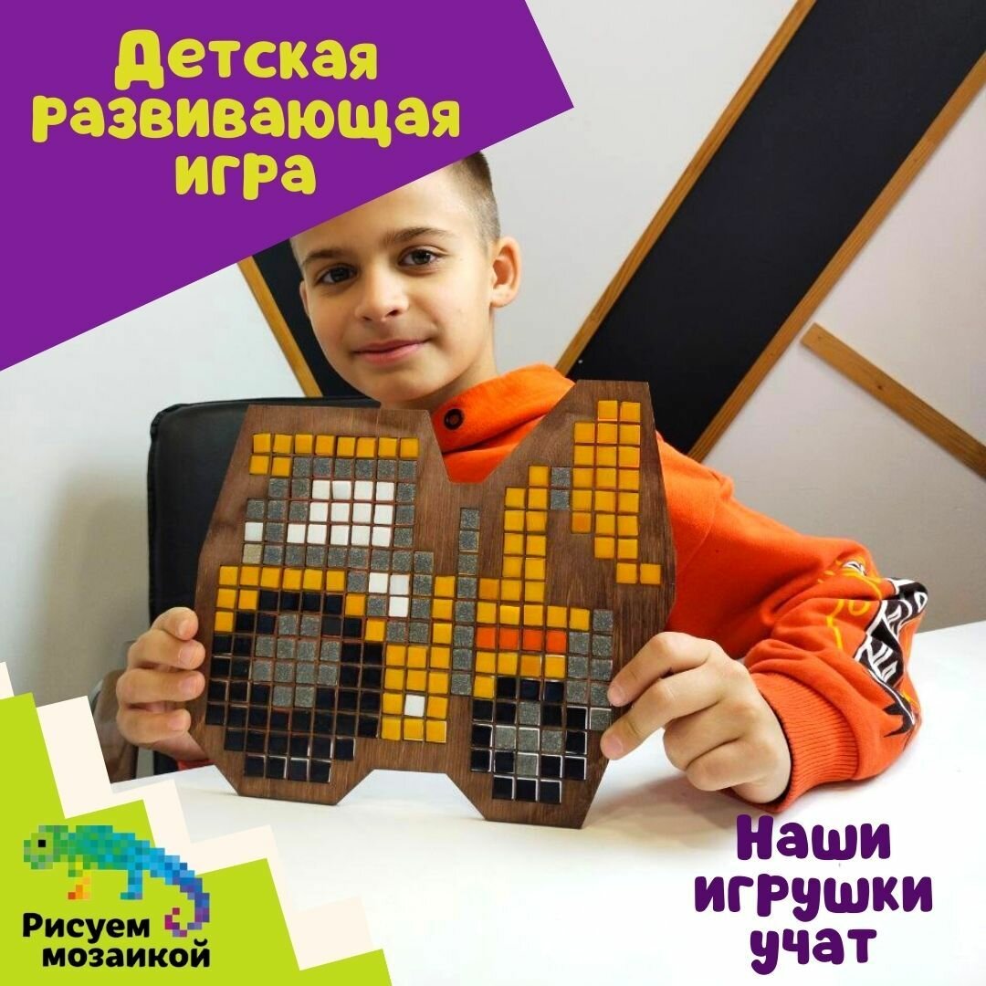 | Дополнительная информация | В комплект входят: Форма-матрица из фанеры и разноцветные фишки из прессованного стекла и мрамора, которые крепятся на клейкую ленту. Есть подставка. Набор упакован в картонную коробку размером 30*30* см. Конструкция мозаики позволяет с лёгкостью фиксировать детали, которые состоят из высококачественных материалов, абсолютно безопасных для здоровья ребёнка. |