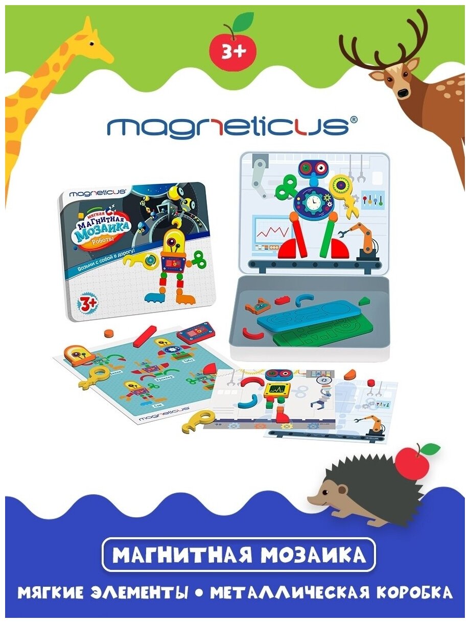 Купить *Мозаика(Magneticus) Магнитная_3+ ВозьмиССобойВДорогу Роботы [метал. коробка;43магн. эл.+3вращ. эл;4фона; накл.] (MC-014)