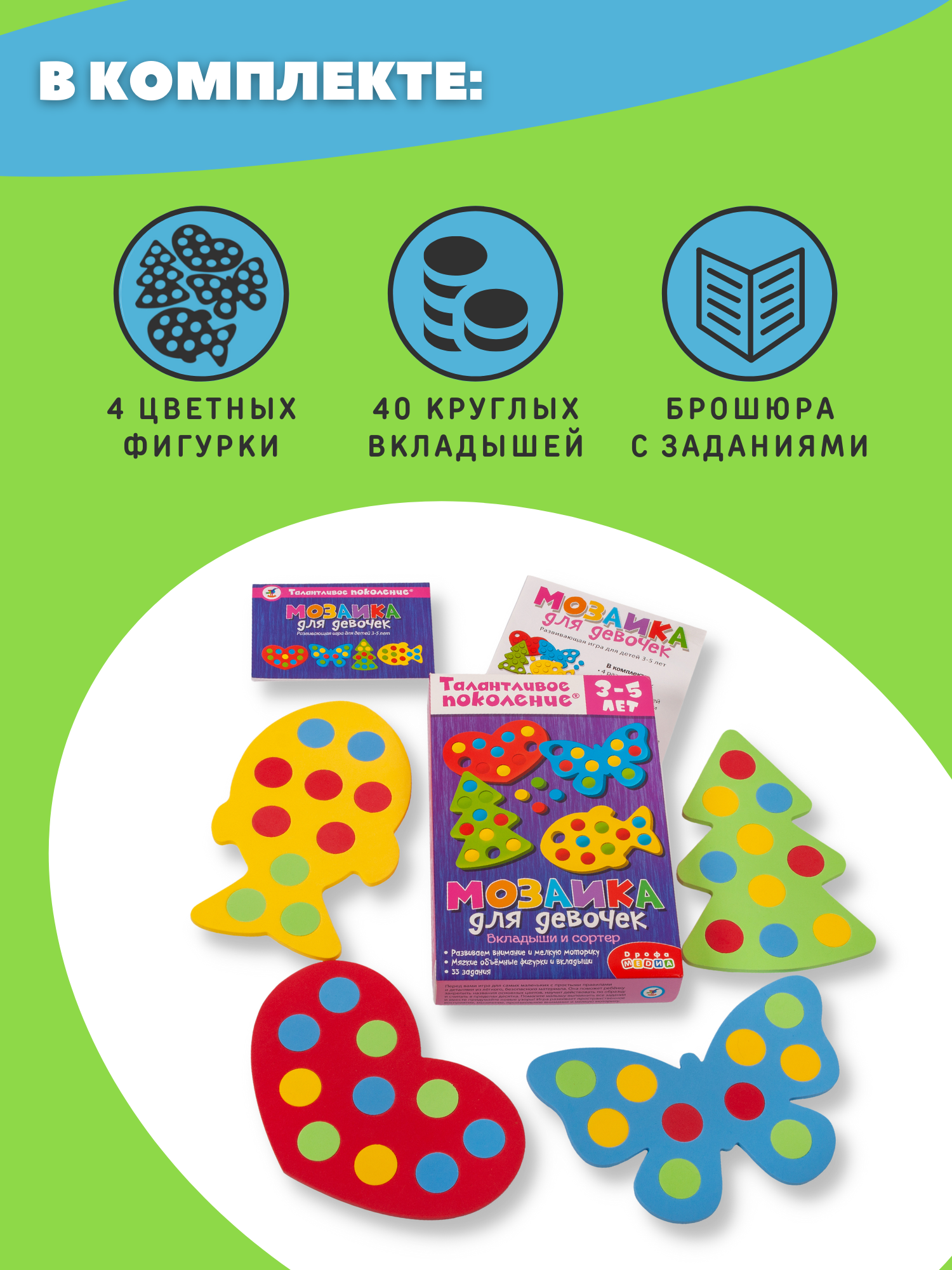 | Дополнительная информация | В комплекте: 4 разноцветных фигурки-основы, 40 круглых вкладышей, брошюра с заданиями, листовка |