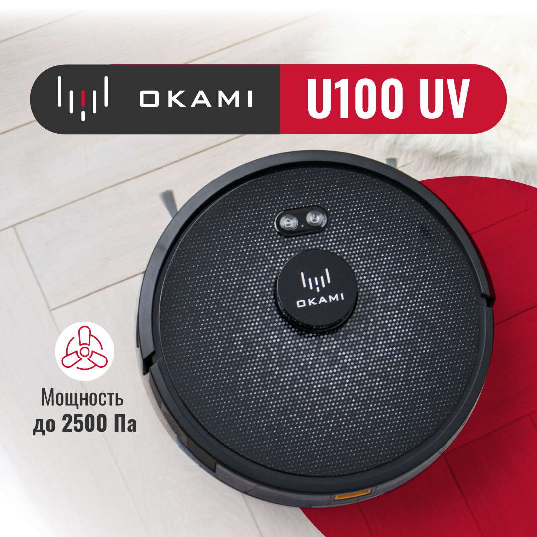 Пылесос с умным баком емкостью 360мл,специальный рисунок движения в виде буквы Y позволяет охватывать 100% поверхности пола, режим влажной уборки можно регулировать в трех режимах. двигатель NIDEC™ с мощностью всасывания до 2500 Па, мощность всасывания можно регулировать в трех режимах. Режим прерванной уборки-если пылесос разрядится по середине уборки, он самостоятельно вернется на зарядную станцию, а после пополнения заряда продолжит убирать комнату с того места, где остановился. Управление через приложение, где есть возможность выстроить виртуальную стену, включать и выключать пылесос, регулировать режимы влажной уборки и мощность всасывания, направлять робот в необходимые места. Звуковые оповещения на русском языке. Центральная турбощетка V-образной формы, способная не только эффективно собирать мелкий бытовой мусор, но и шерсть домашних животных. Форма щетки не позволяет ворсу наматываться, а для ее мытья требуется минимум времени и усилий. Существует версия Okami U100Plus, в комплект которой входит ультрафиолетовая лампа. Насадка не только позволяет более эффективно устранять загрязнения, но и бороться с появлением новых бактерий. УФ-лампа включается автоматически во время уборки.