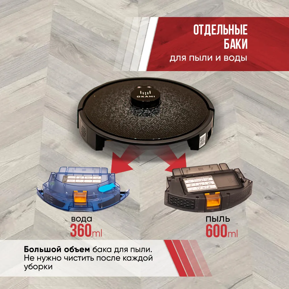 Робот-пылесос Okami U100 Laser plus может и мыть и пылесосить одновременно, что ускоряет и делает уборку довольно качественной. Отличная навигация, понятное управление, можно самим выставить необходимый уровень мощности, разный для разных помещений. Можно остановить уборку и перенаправить в другое место и так же вернуть обратно. Я очень довольна.