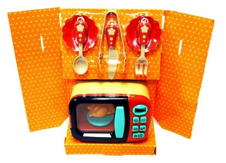 | Комплектация | - игрушка свч печка; - игрушечная курица; - набор посуды: 2 тарелки / ложка / вилка / щипцы для салата. |