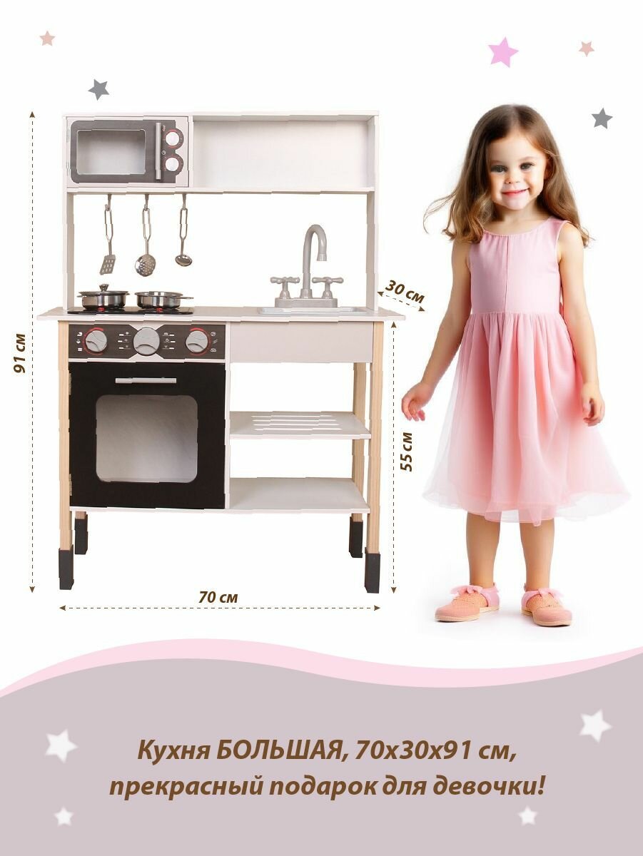 Детская деревянная кухня "Флаффи" с водой, светом и звуком, Lisa Doll / Игровая кухня с посудой и аксессуарами для детей