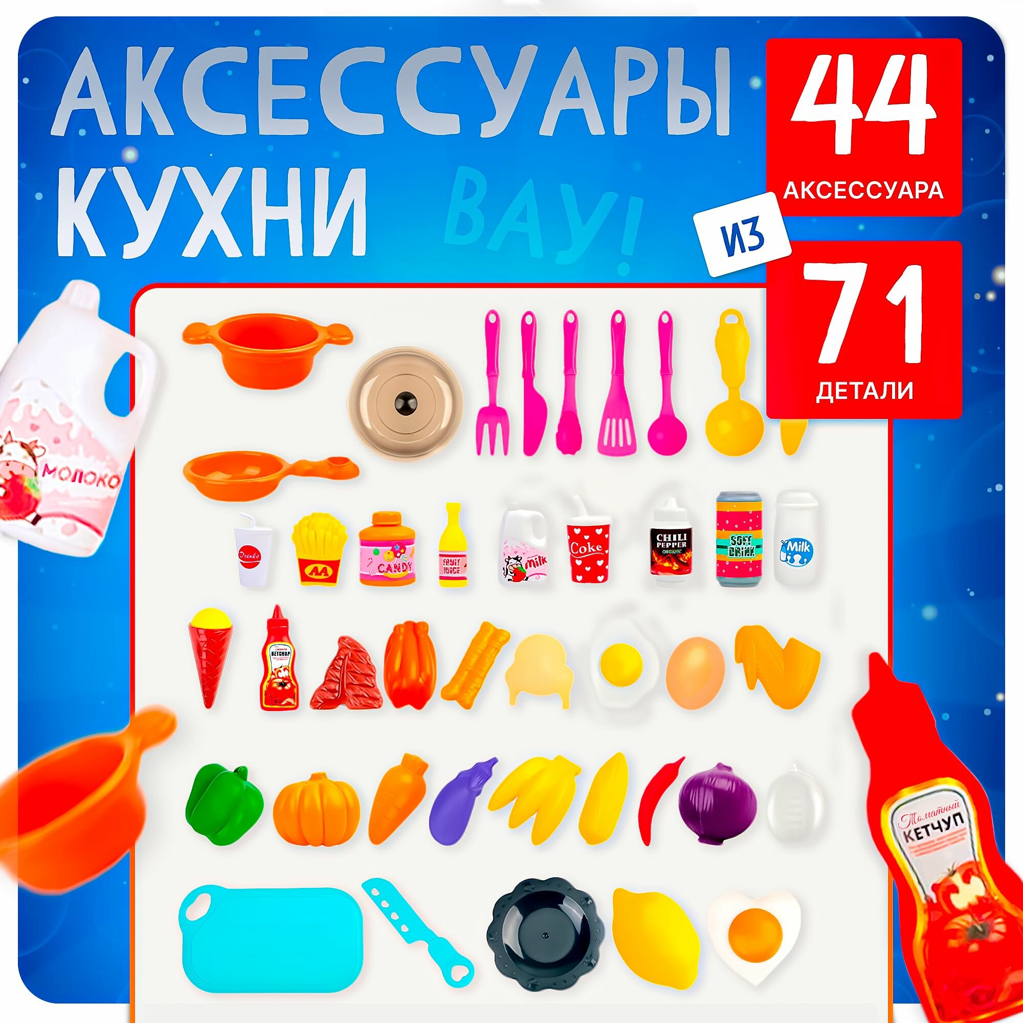 | В комплекте | игрушечная еда, кухонная утварь, плита, посуда, раковина |