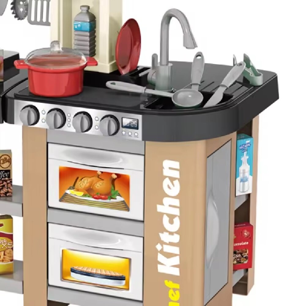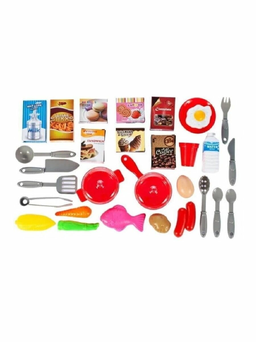 Детская игровая кухня. Свет, звук, с водой, паром, набором посуды и продуктов, ручки крутятся, 77 предметов