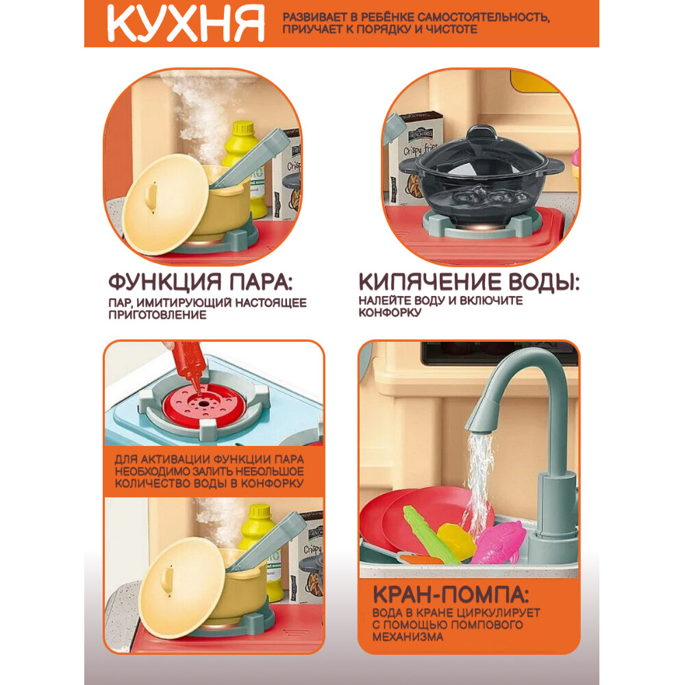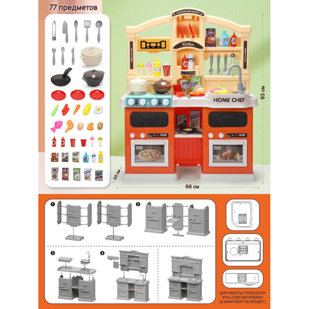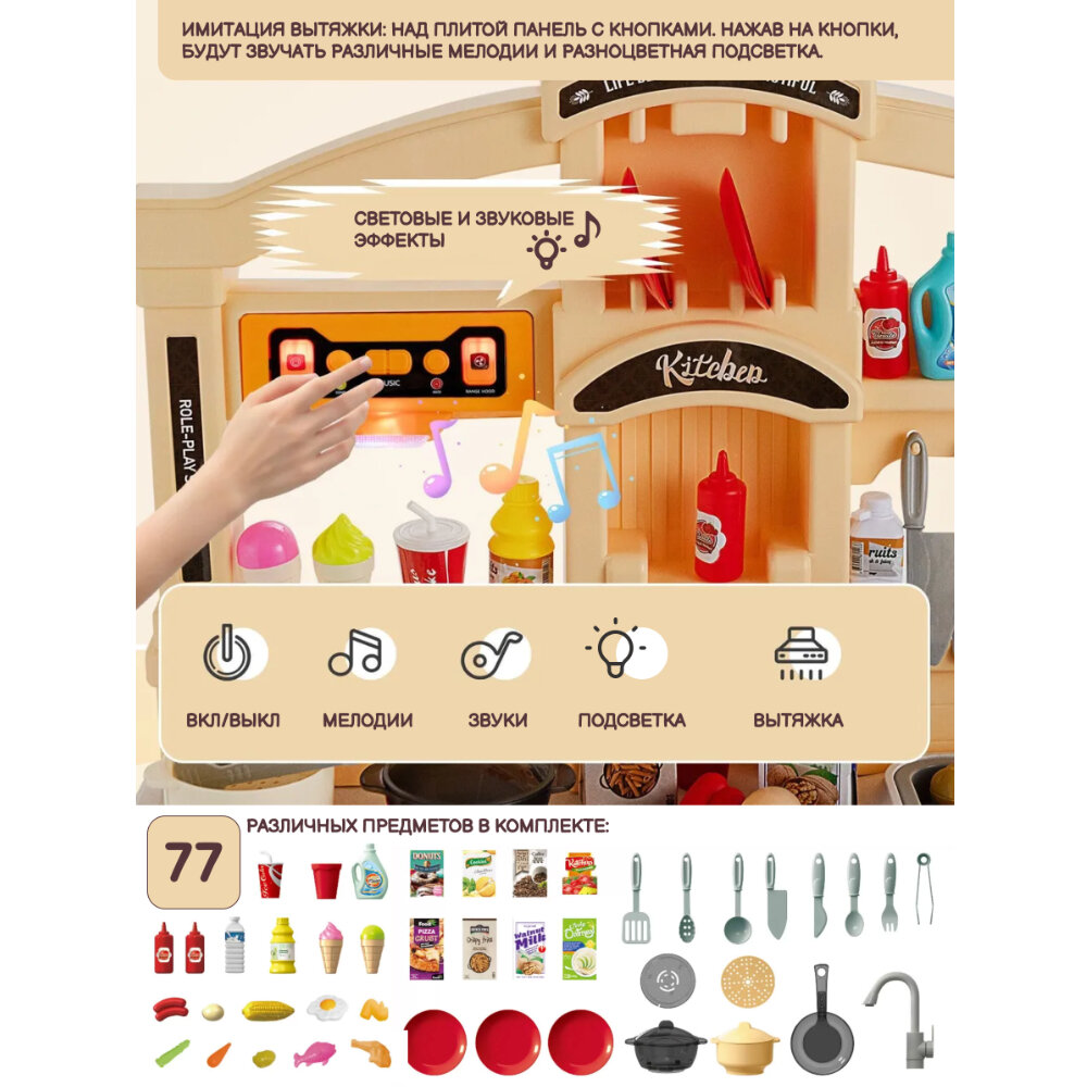 Купить Детская игровая кухня. Свет, звук, с водой, паром, набором посуды и продуктов, ручки крутятся, 77 предметов