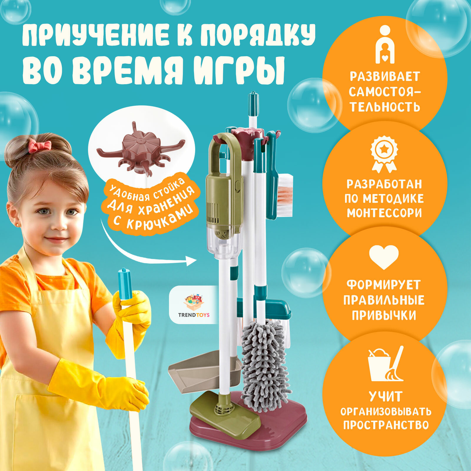 | Комплектация | принадлежности для детской уборки / пылесос игрушечный / подставка для хранения |