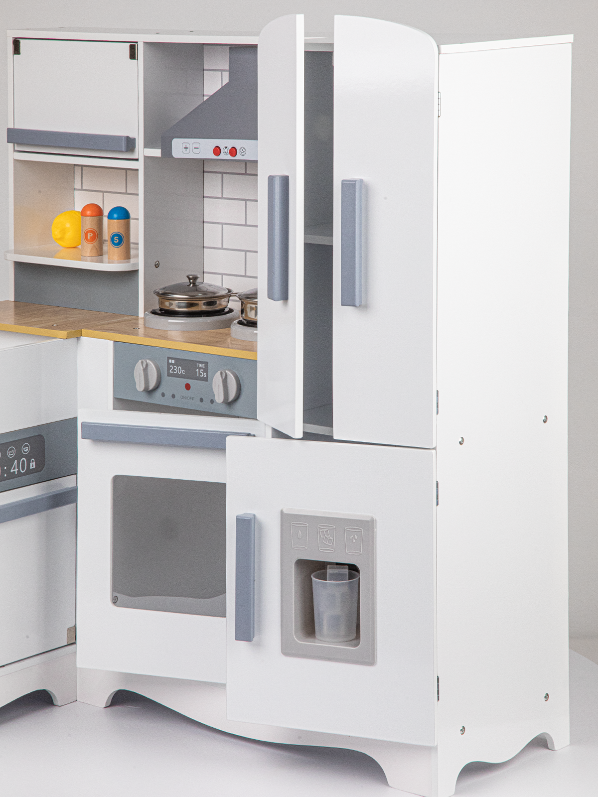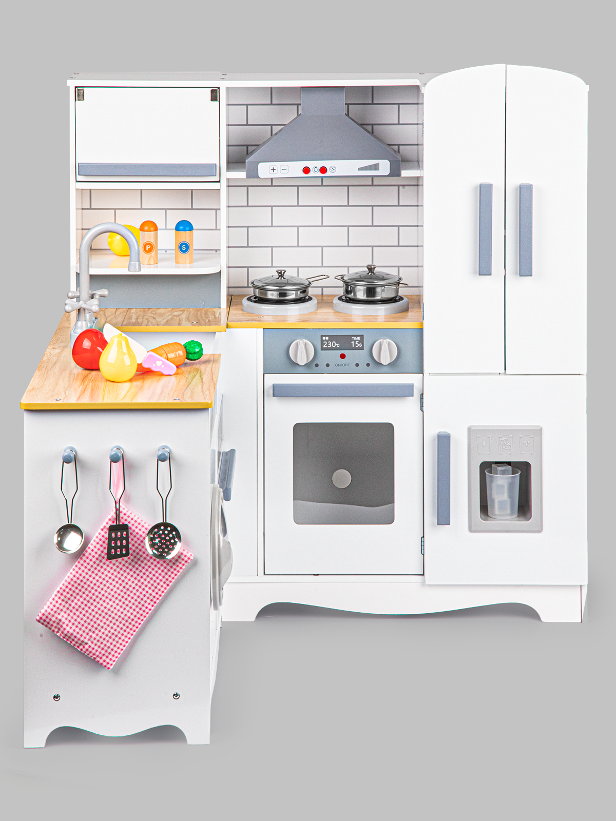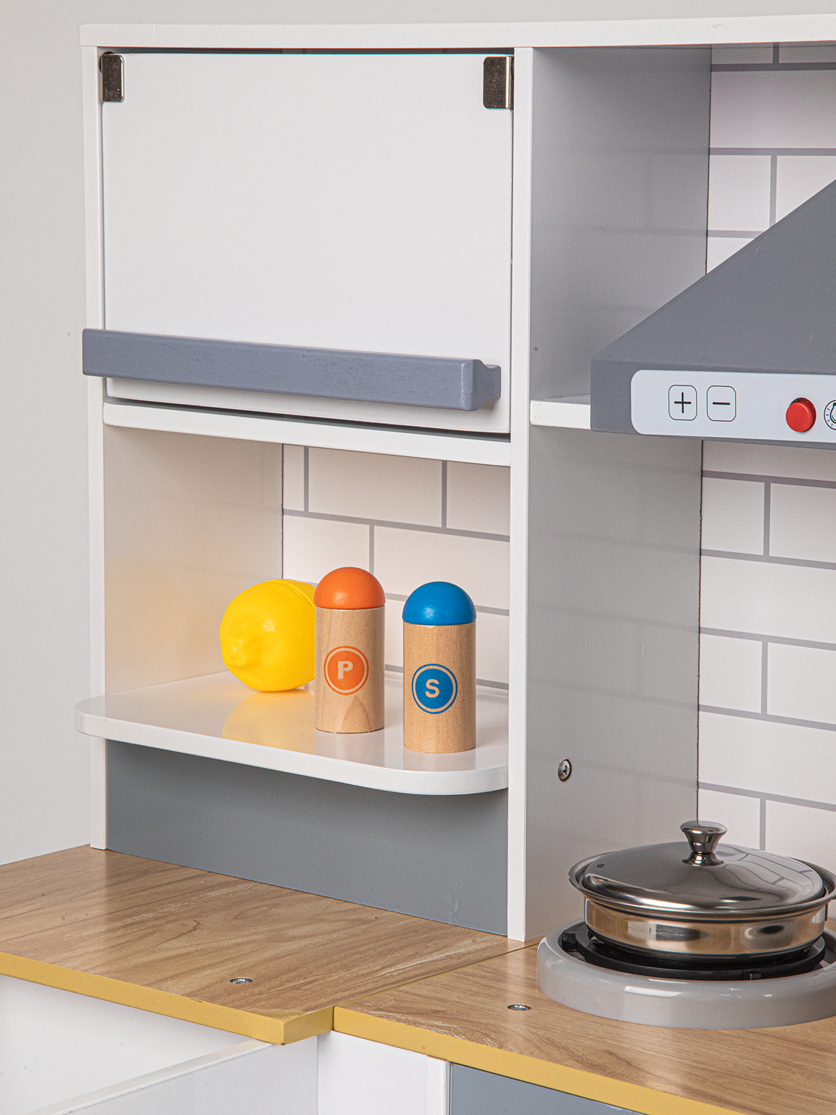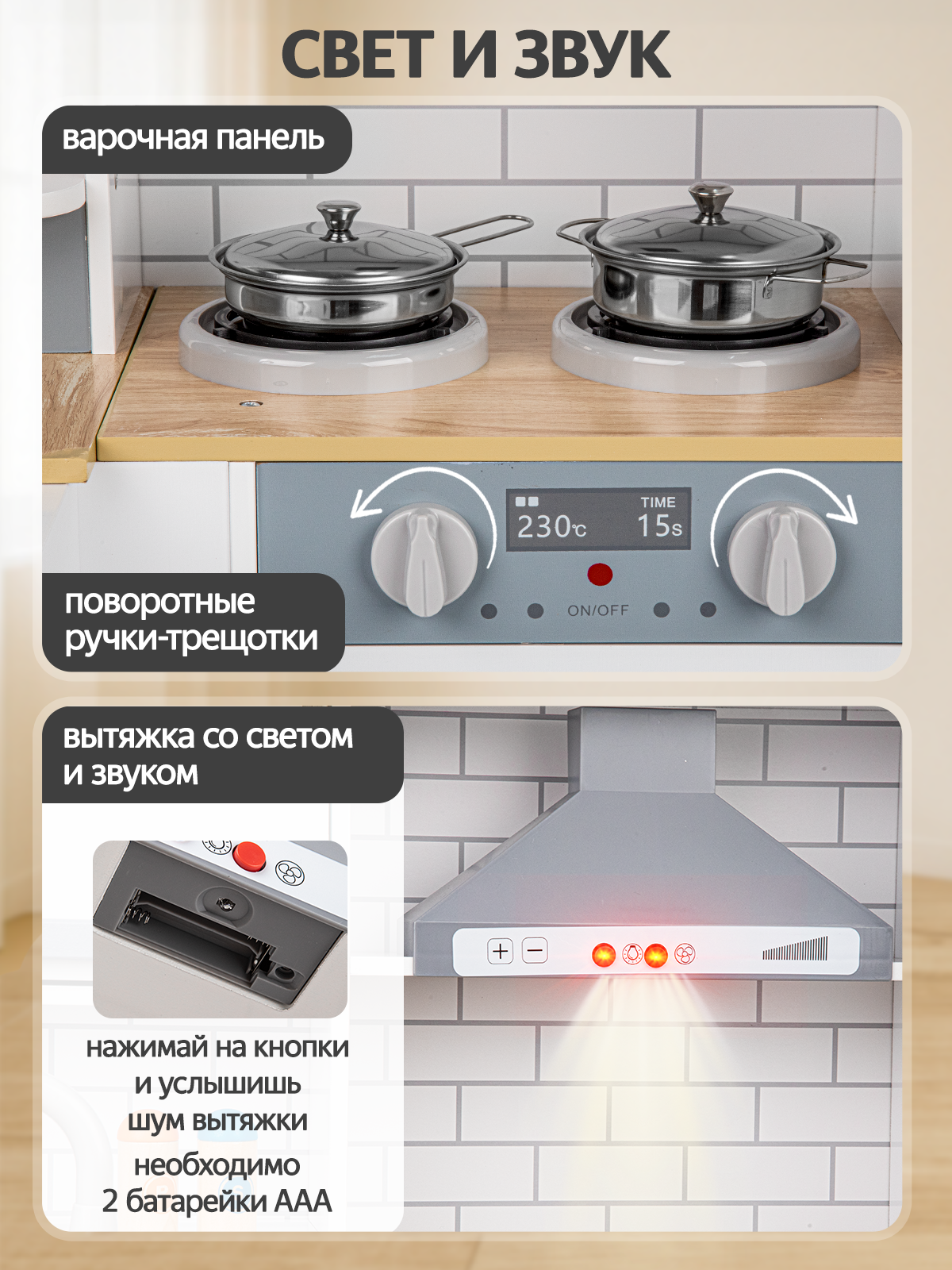 Кухня детская игровая, деревянная 94см, свет, звук, с аксессуарами, серая