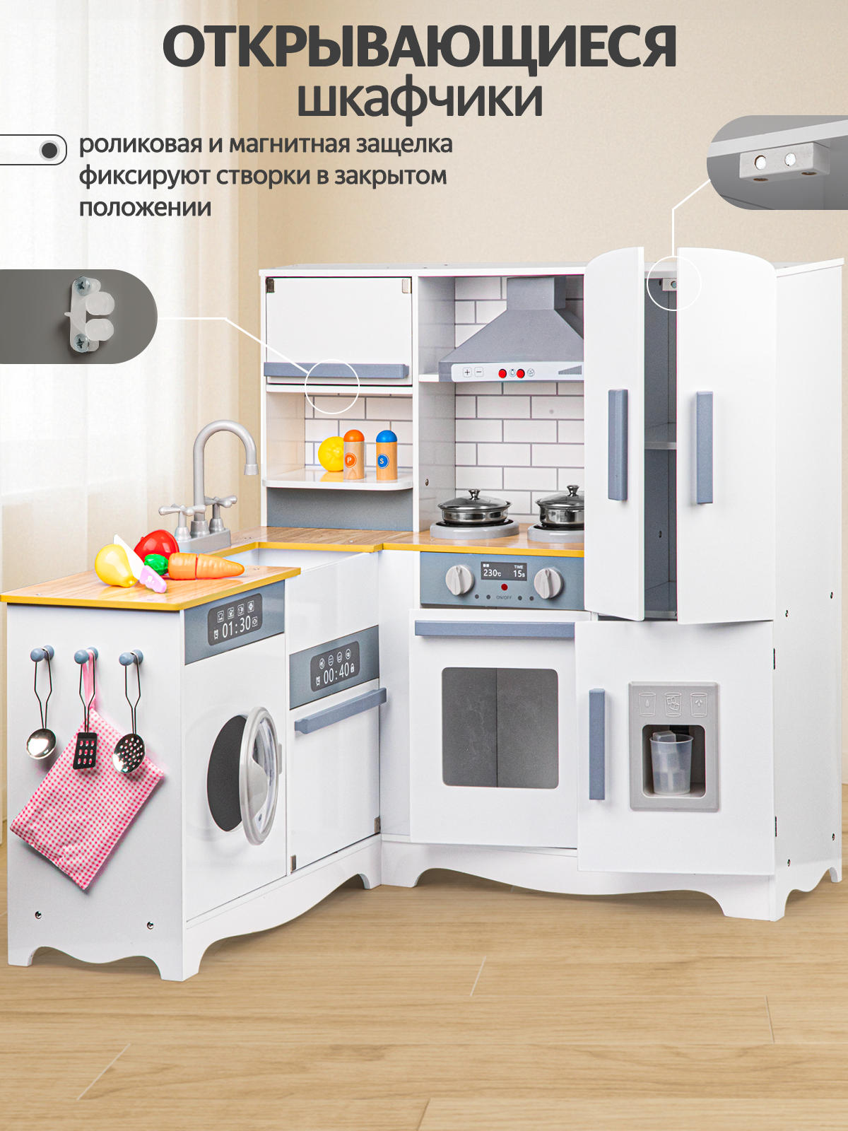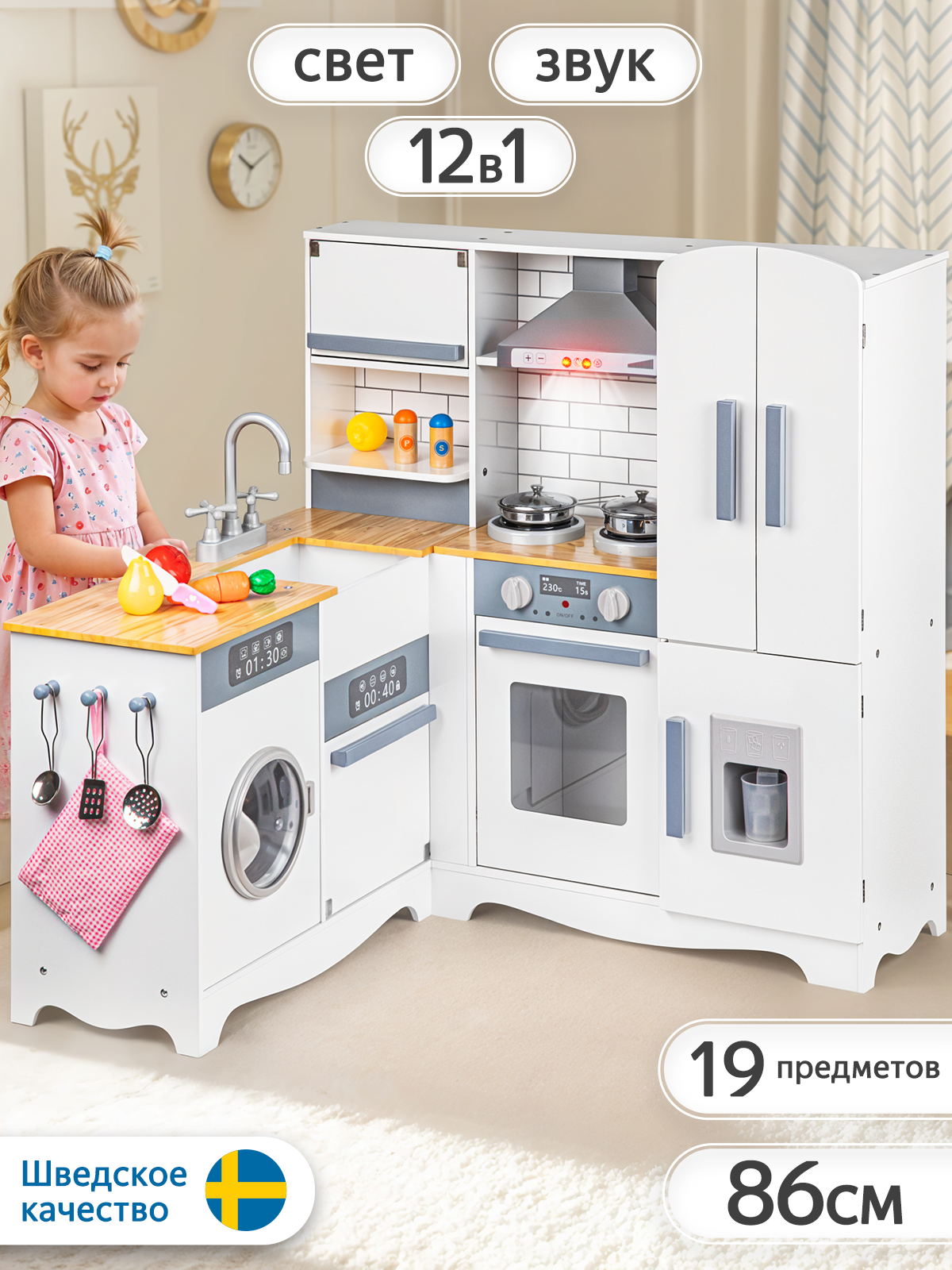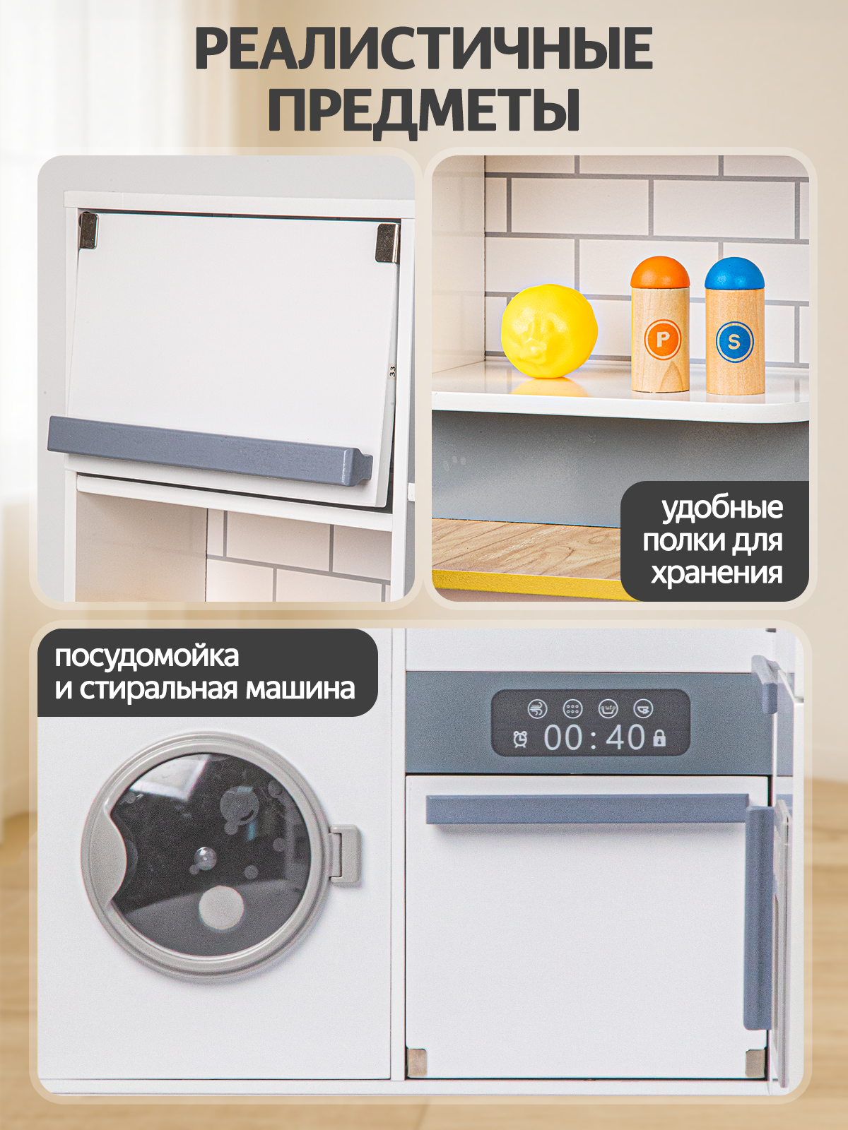 Кухня детская игровая, деревянная 90 см, с аксессуарами, свет, звук, белая