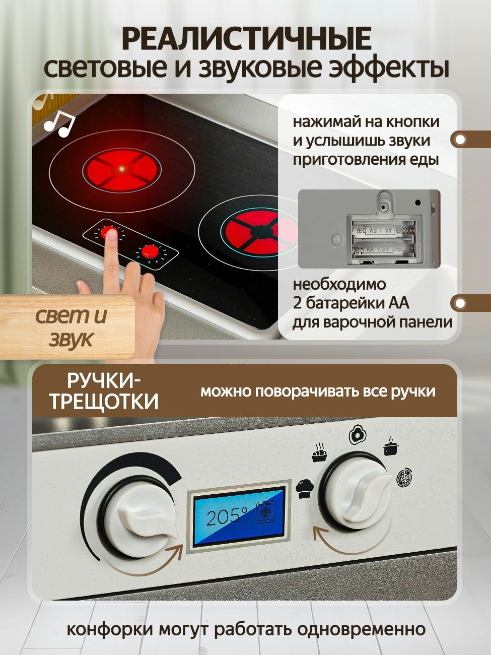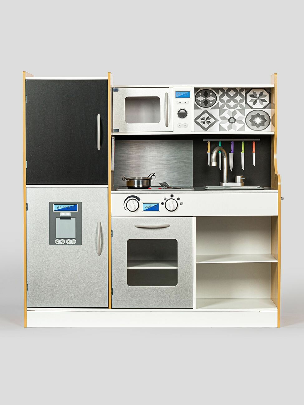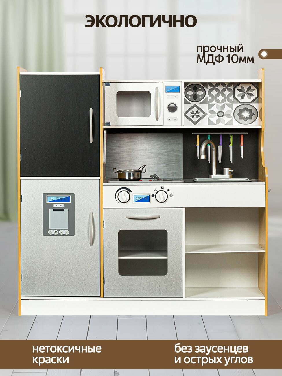 Кухня детская игровая, деревянная 94см, свет, звук, с аксессуарами, серая