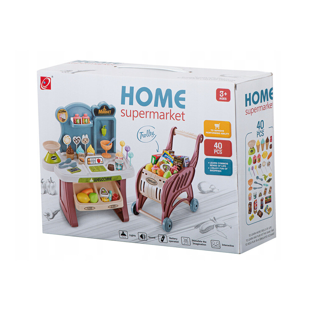 | Комплектация | супермаркет с кассой (размер в собранном виде 37х20х38.5см) / тележка детская для супермаркета (размер 30х17.5х29.5см). Также в комплект входит 40 предметов: весы с подвижной чашей / банковская карта / кран с подвижной ручкой / щипцы / ложка / креманка / лимон / груша / морковь / стаканчик / попкорн / баночка / упаковки / игрушечные продукты / а также сладости: разноцветные леденцы на палочке / рожок мороженое / конфеты. |