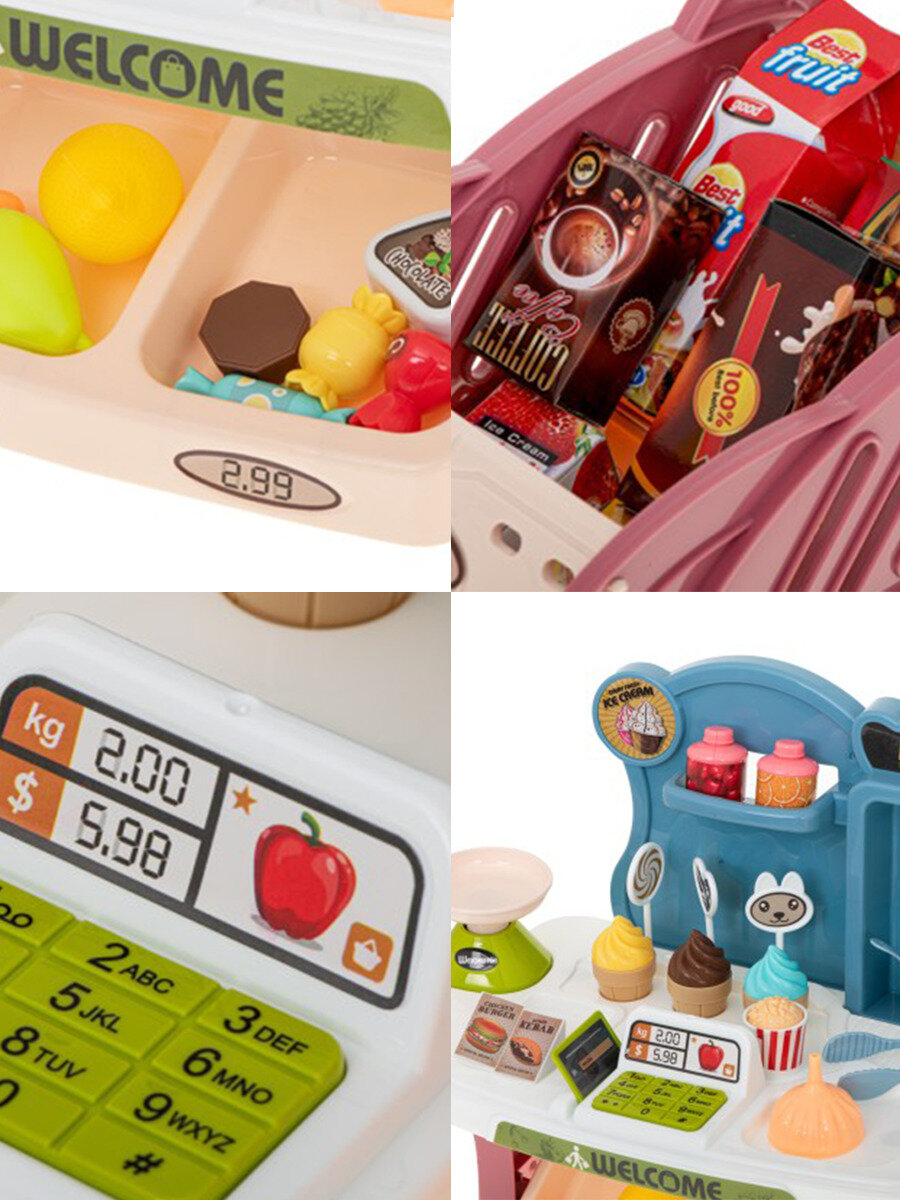 | В комплекте | банковская карта, весы, витрина, деньги, кассовый аппарат, продукты, тележка |