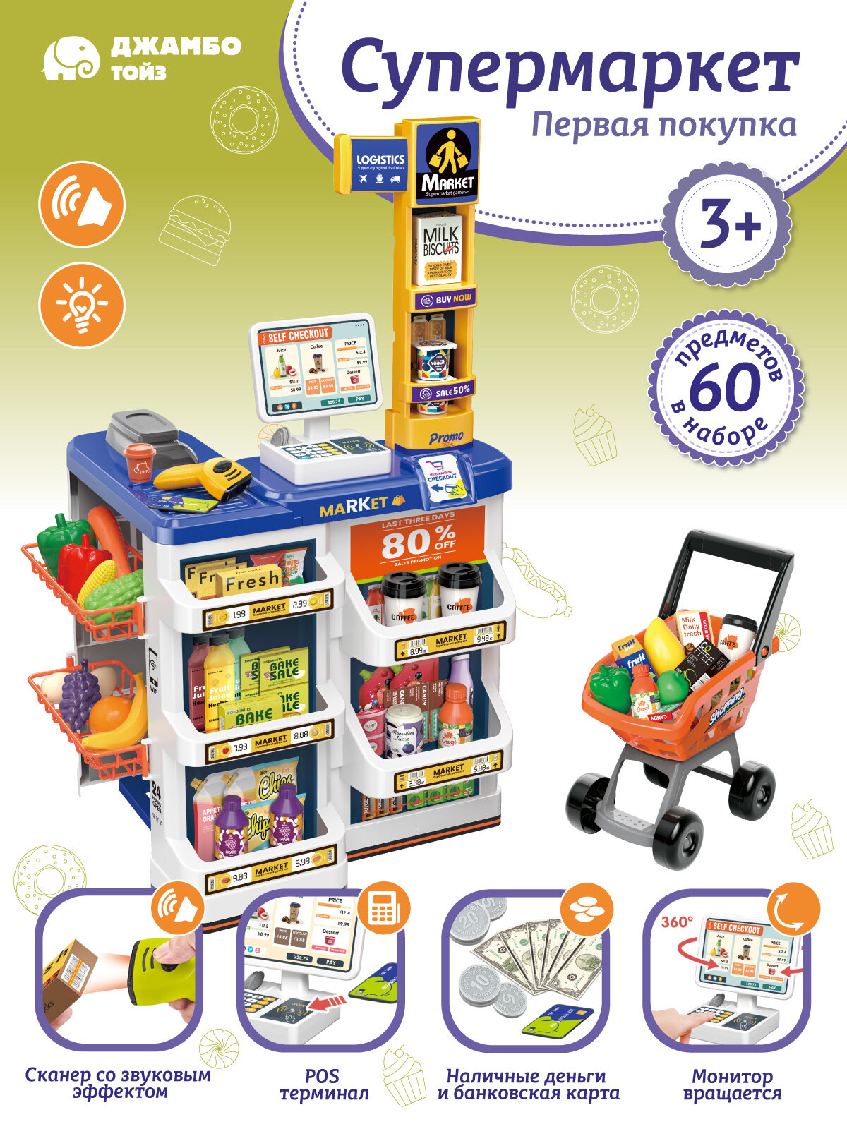 Купить Супермаркет "Первая покупка", большой игровой набор, 60 предметов, сканер, тележка, свет, звук, JB0213134