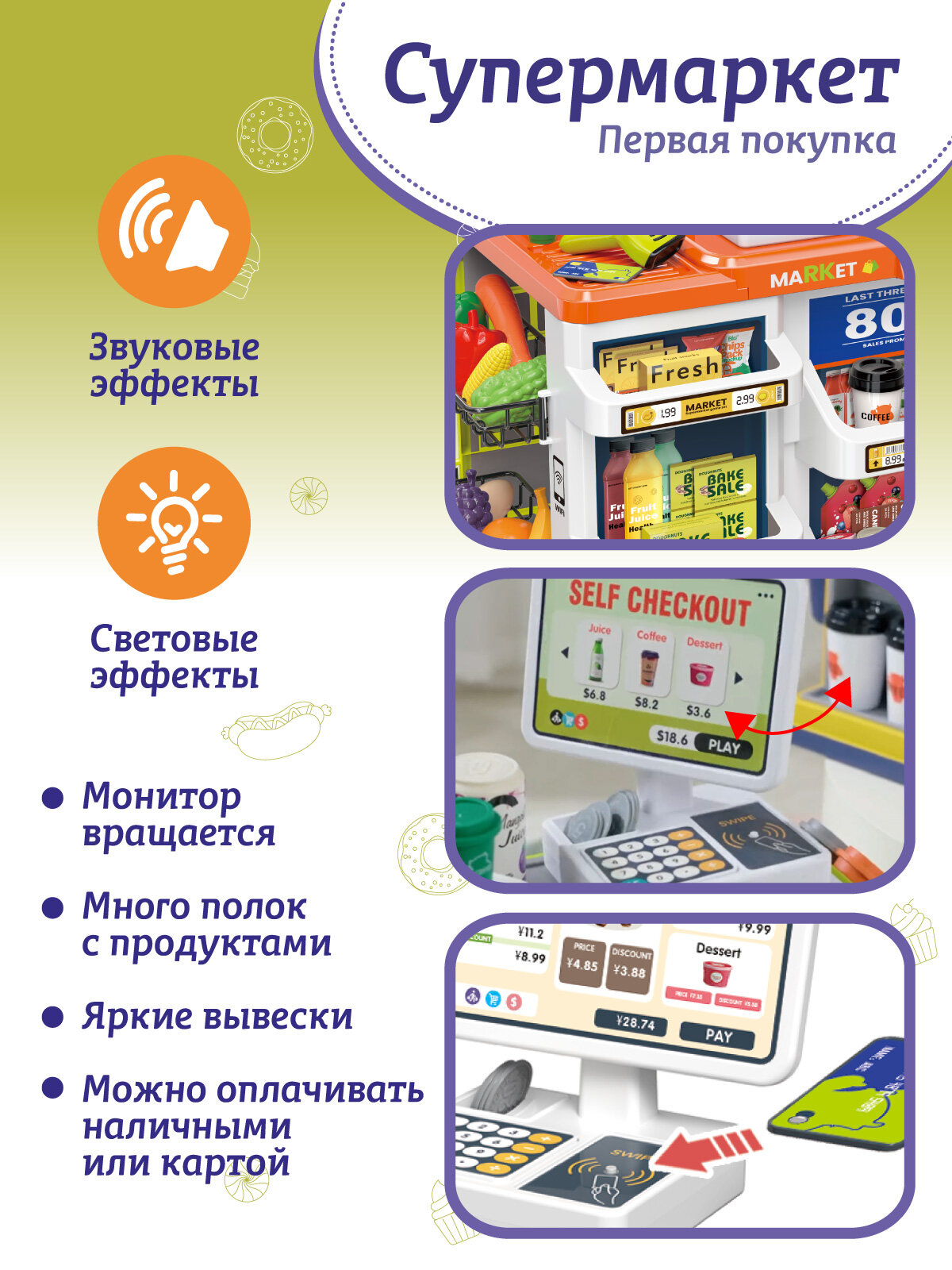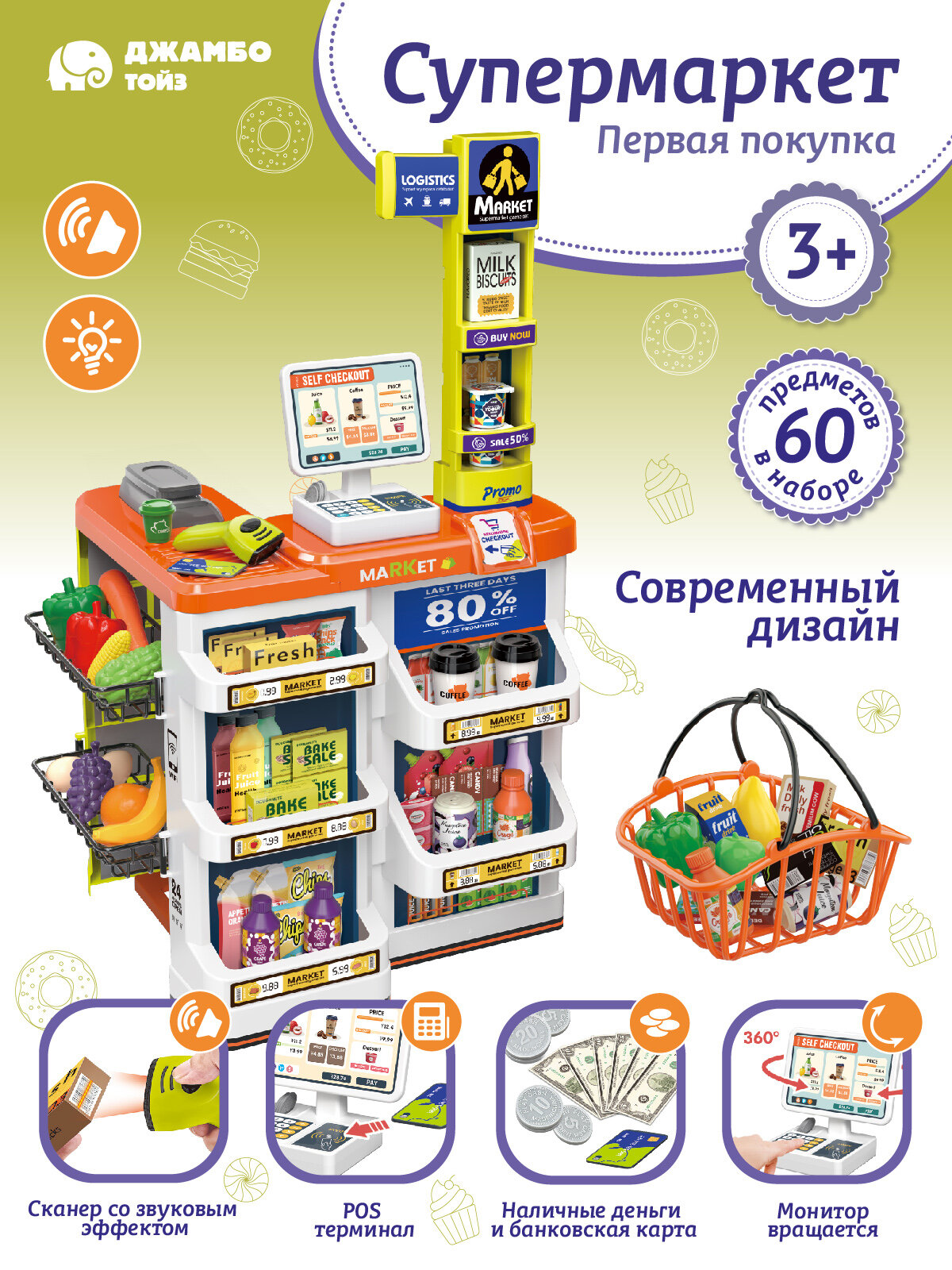 Купить Супермаркет Первая покупка с корзинкой, игровой набор, сканер/терминал/деньги, свет/звук, JB0213135