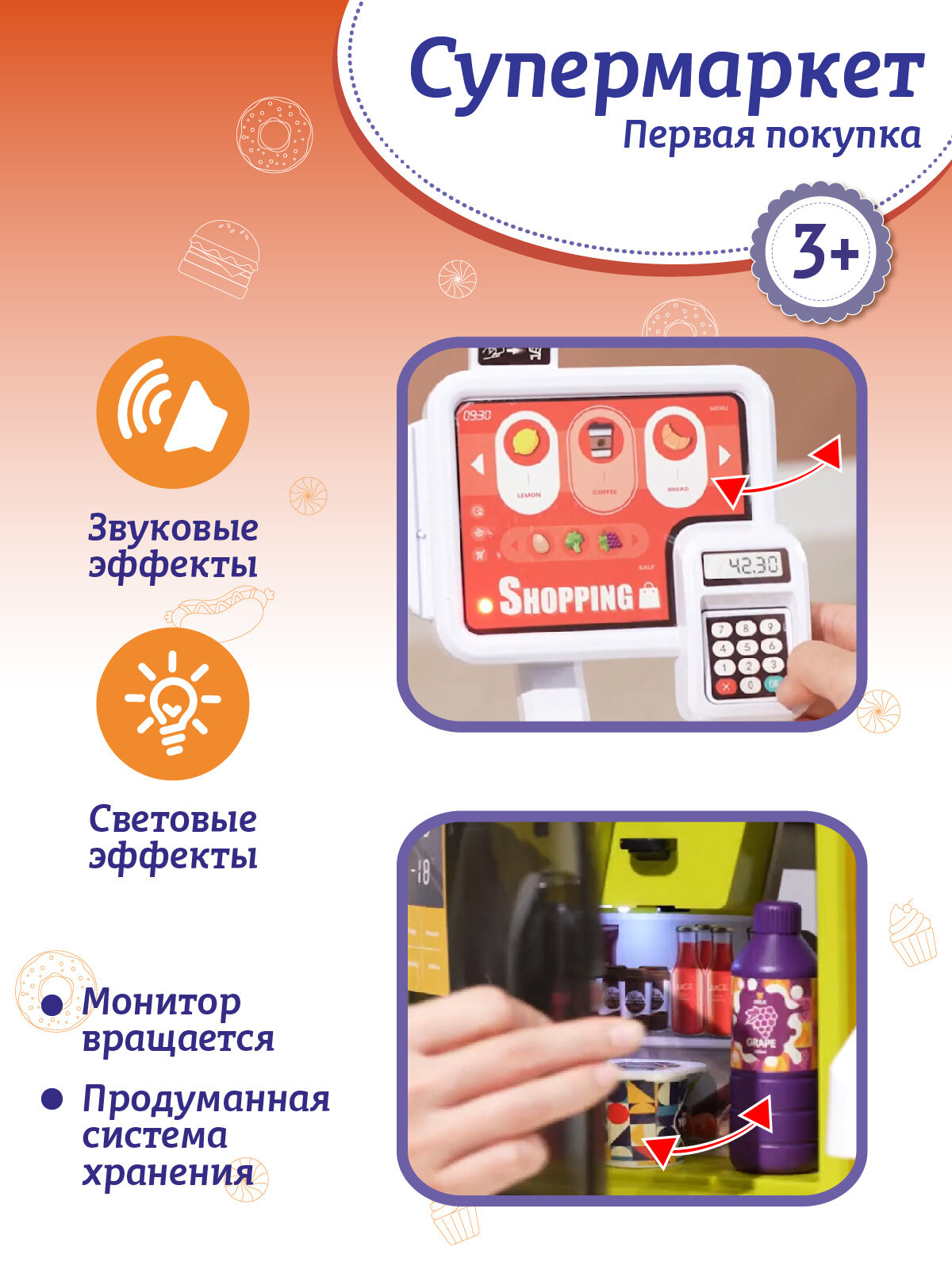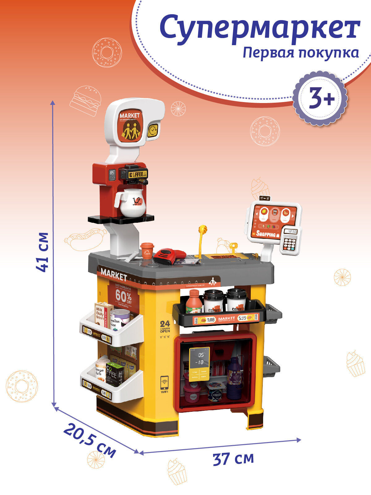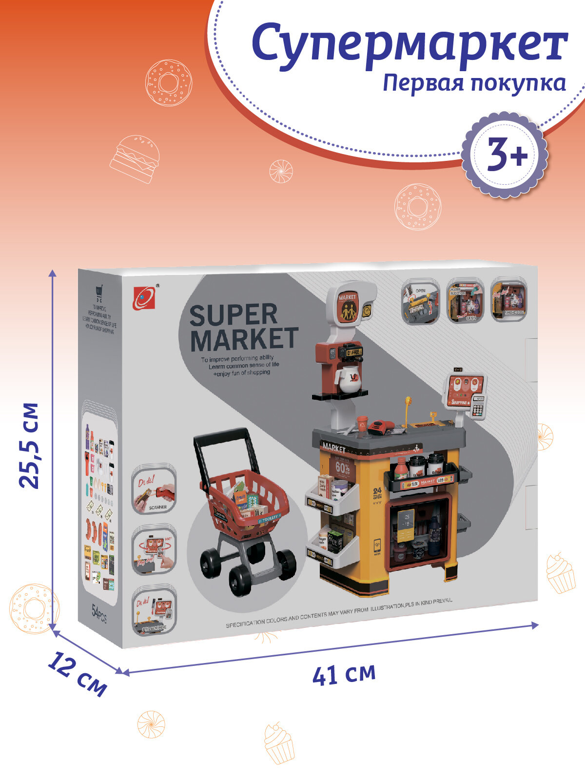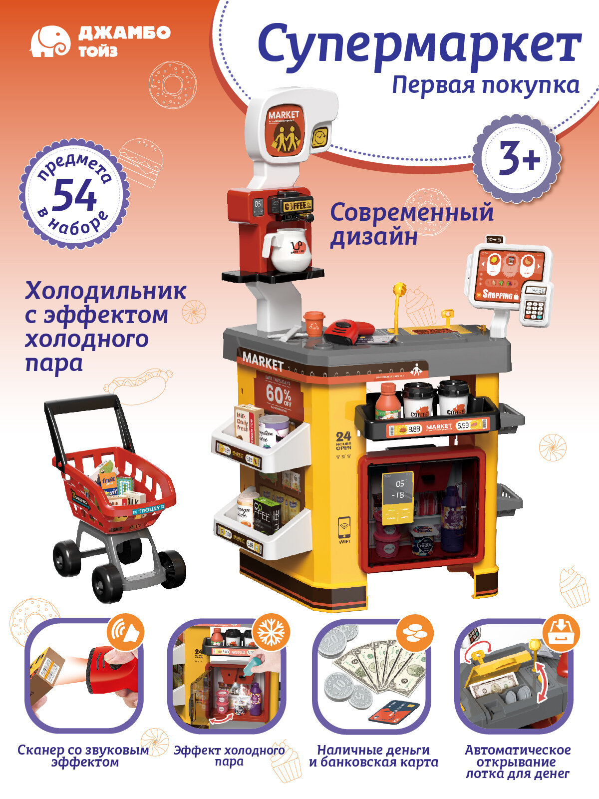 Супермаркет "Первая покупка", игровой набор, холодильник с холодным паром, сканер, тележка, свет, звук, JB0213213 интересное: