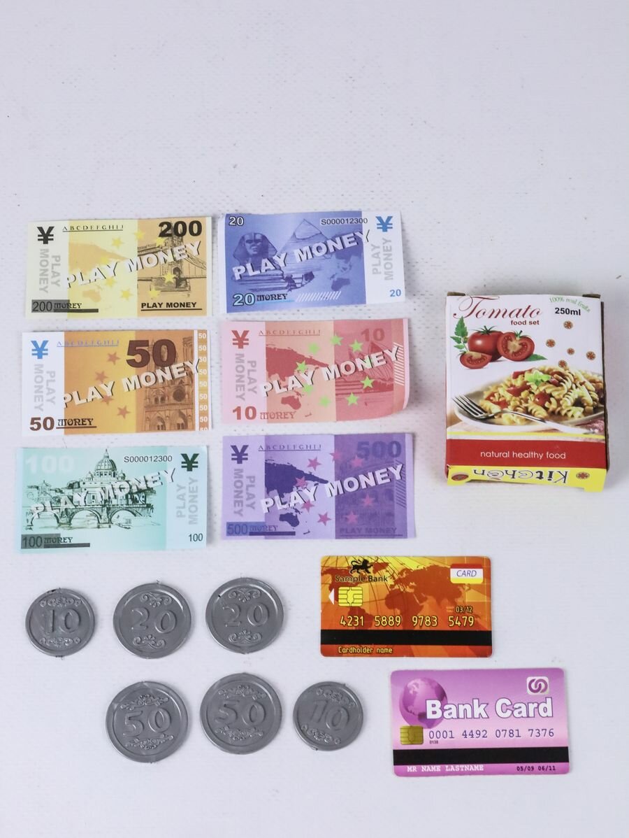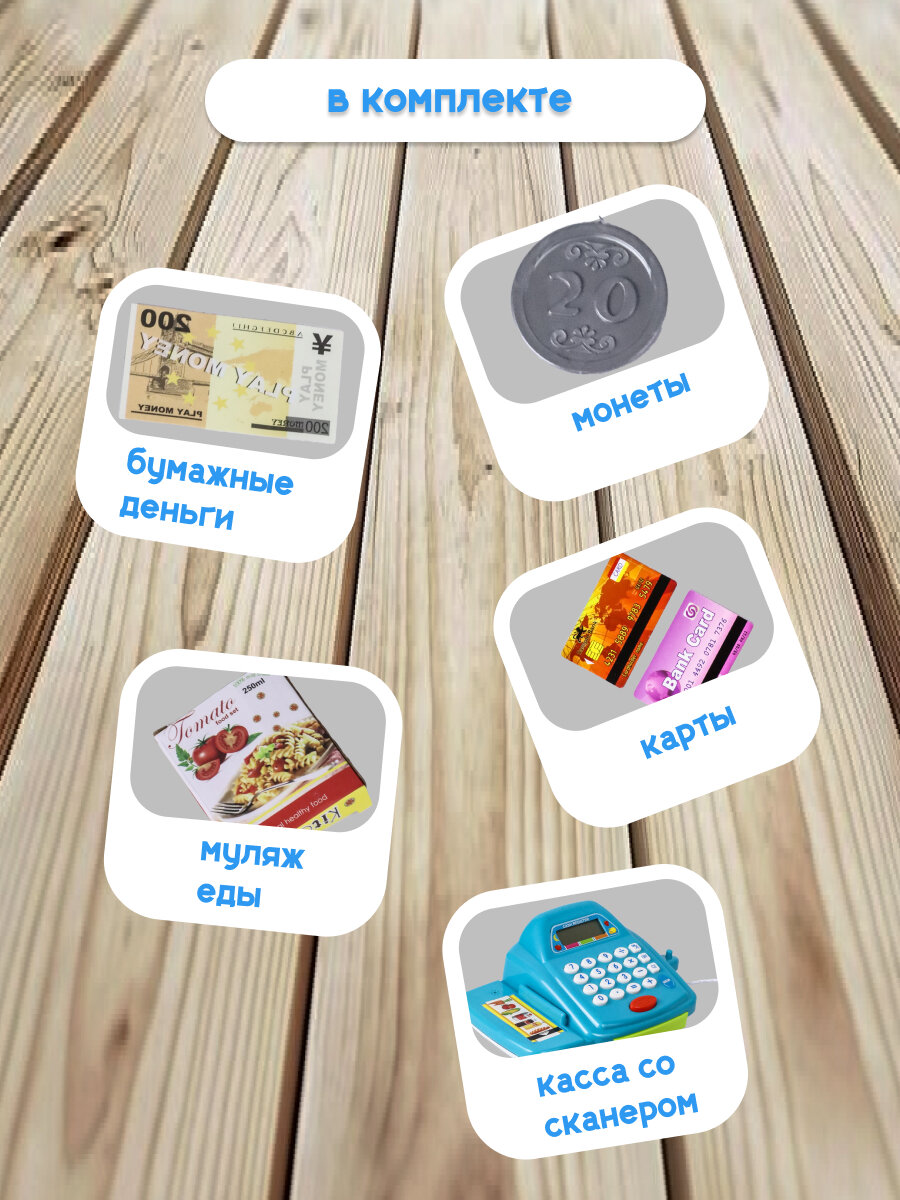 | Комплектация | касса со сканером; бумажные деньги; монеты; карты банковские; коробочка приправы |