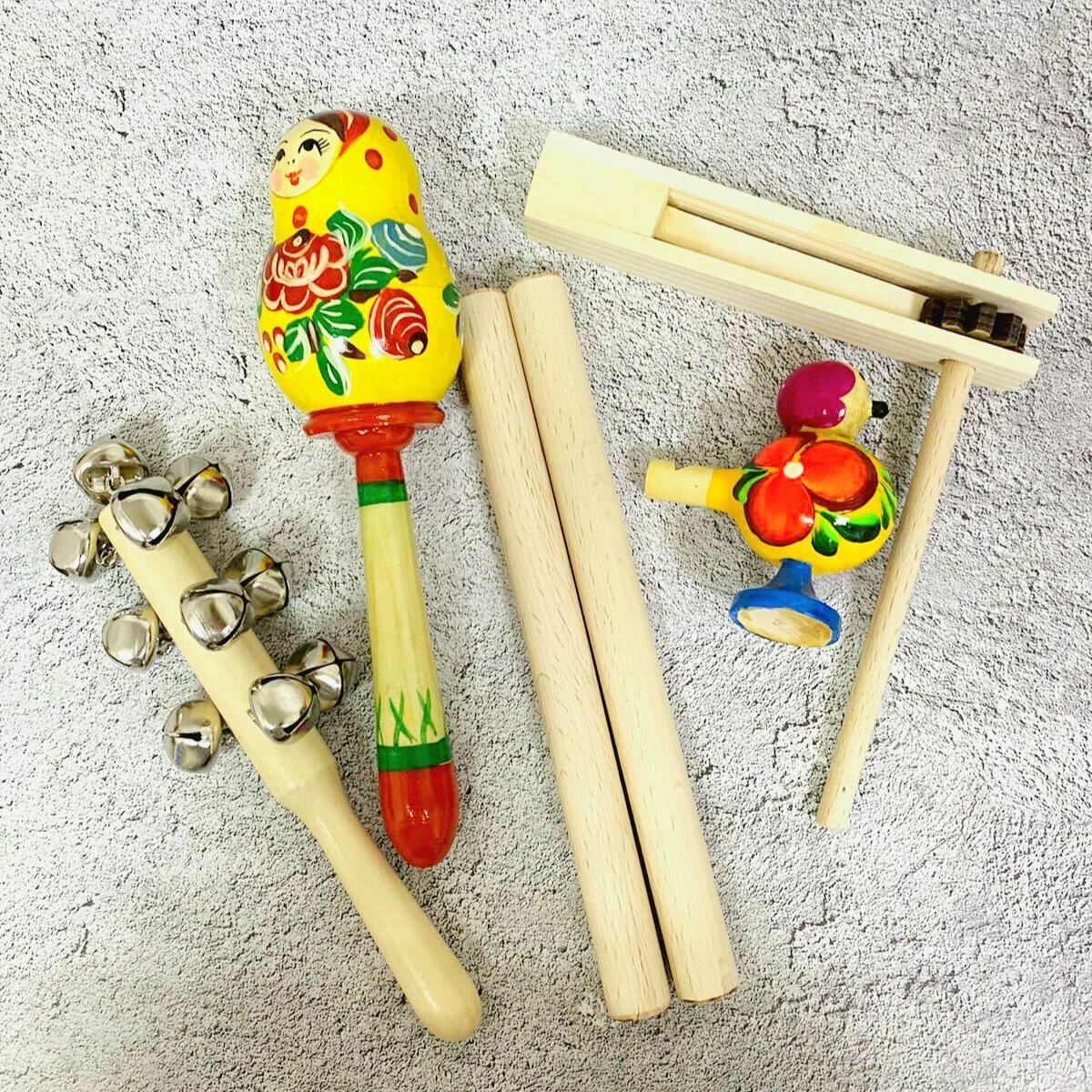 Купить Набор детских музыкальных инструментов, 6 предметов (клавесы, свистулька, трещотка, погремушка , погремушка с бубенцами)
