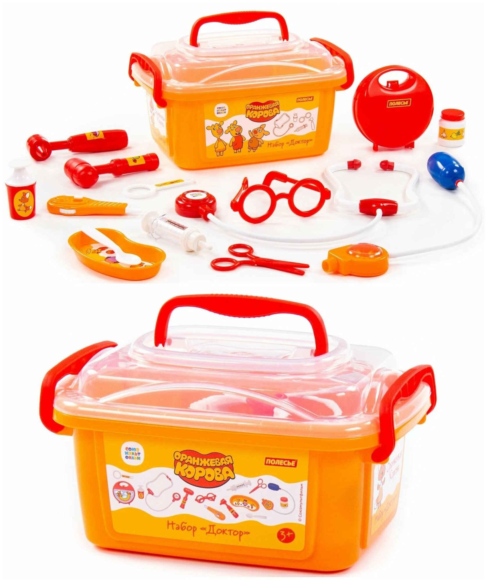 Купить Игровой набор доктора с 14-ю инструментами и наклейками Оранжевая корова с саквояжем-контейнером врача для детей