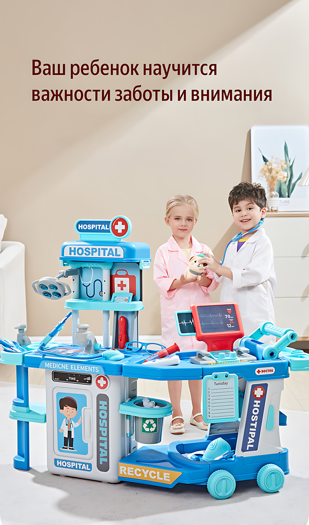 СохранитьНабор доктора детский большой, 13 аксессуаров, со светом и звуком, 90х32х76 см, розовый интересное: